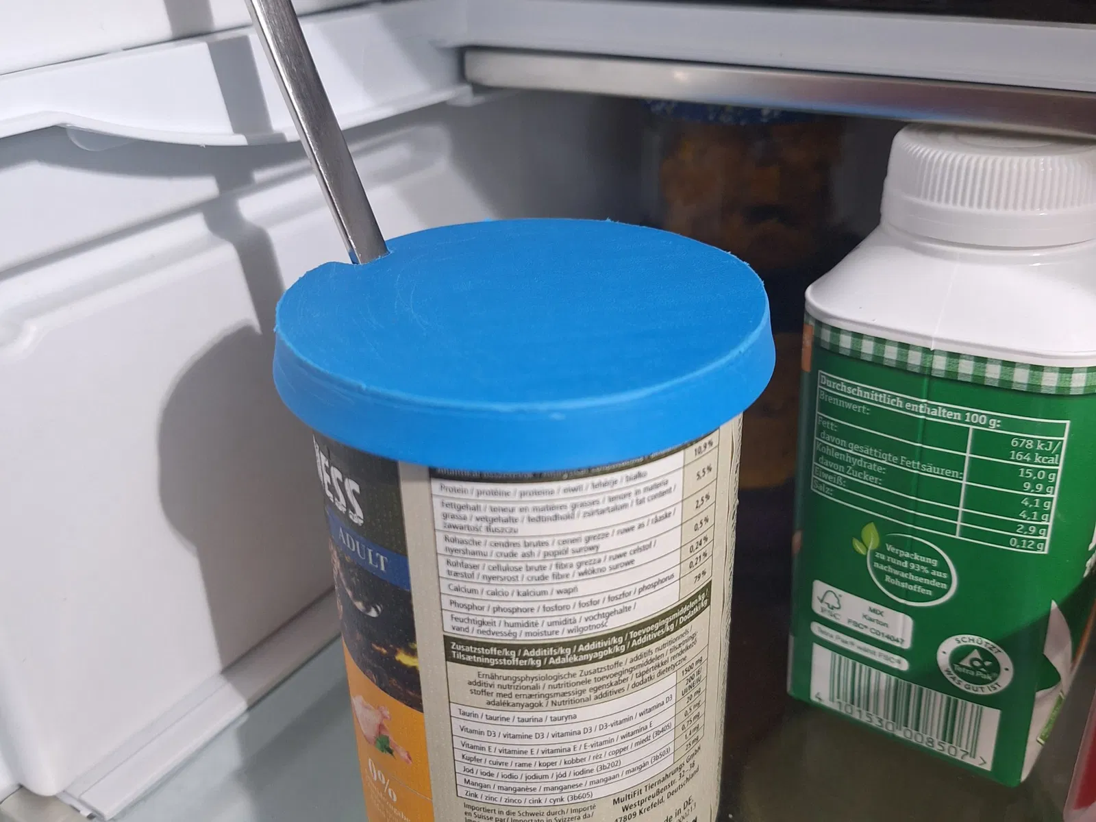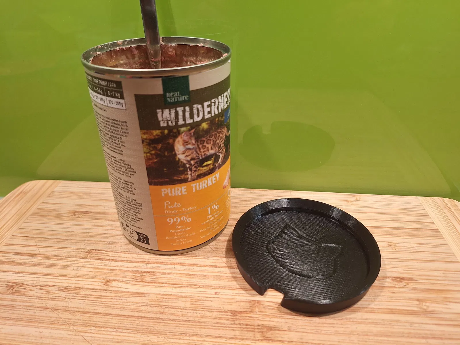 Mèo của tôi ăn thức ăn từ những hộp tiêu chuẩn 73x110mm, và tôi thích để hộp mở trong tủ lạnh (đặc biệt là vào mùa hè). Tôi không muốn sử dụng một cái muỗng mới mỗi lần, vì vậy tôi đã thiết kế nắp linh hoạt này với một lỗ để muỗng có thể nhô ra.