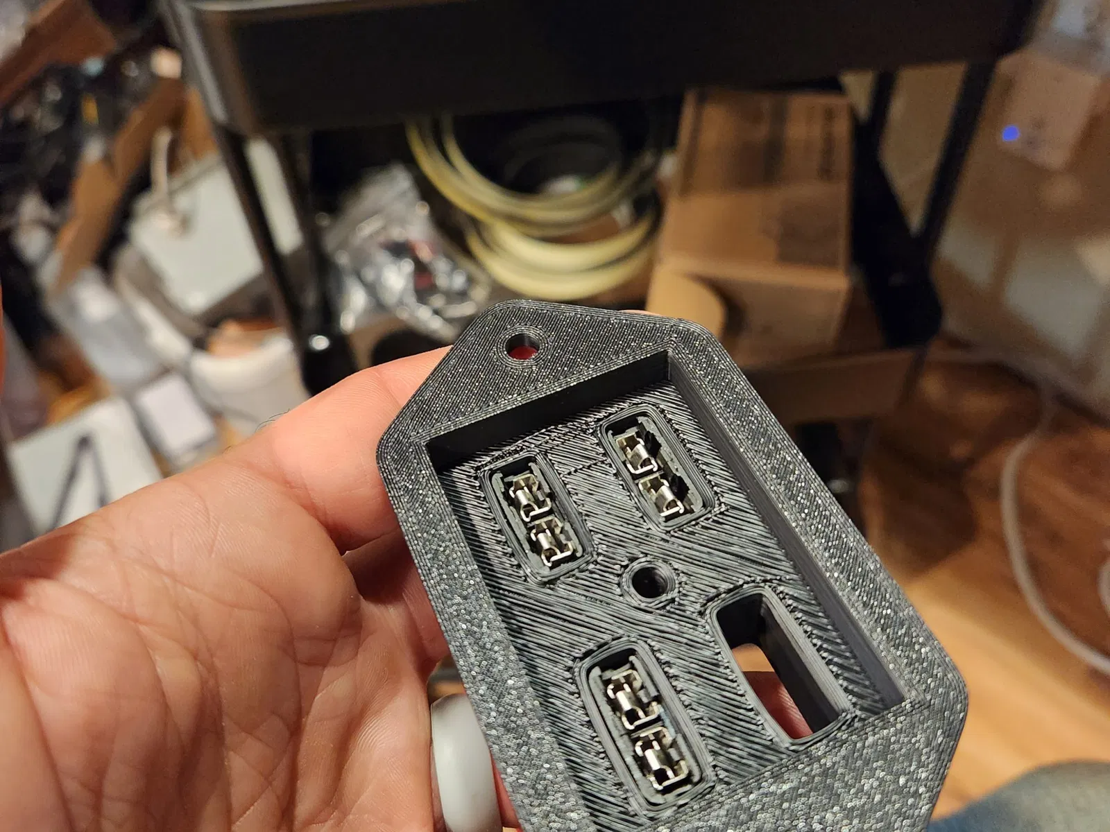 Cũng cần một bộ chèn nhiệt M4, và một vít có rãnh (m4) và đai ốc, hoặc tự làm vít điều chỉnh của riêng bạn. Máy kéo của tôi sử dụng 3 cầu chì, nhưng tôi biết một số sử dụng 4 tùy thuộc vào các tùy chọn, vì vậy tôi đã xây dựng nó với tùy chọn cho 4 cầu chì, bất kỳ khoảng trống cầu chì nào không sử dụng có thể được che ở mặt sau bằng nắp cầu chì, và tôi cũng đã thiết kế một giá đỡ cầu chì rơi vào vị trí không sử dụng đó và giữ một cầu chì dự phòng. Tôi đã in trên Voron 2.4r2 của mình bằng ASA màu đen để làm cho nó chống UV, và nắp có một khe ở phía dưới để một mảnh TPU được dán siêu dính vào làm kín chống lại bảng điều khiển. Vì tôi chưa có bộ chèn nhiệt M4, nó không có trong hình, nhưng tôi nghĩ vị trí của nó là rõ ràng.