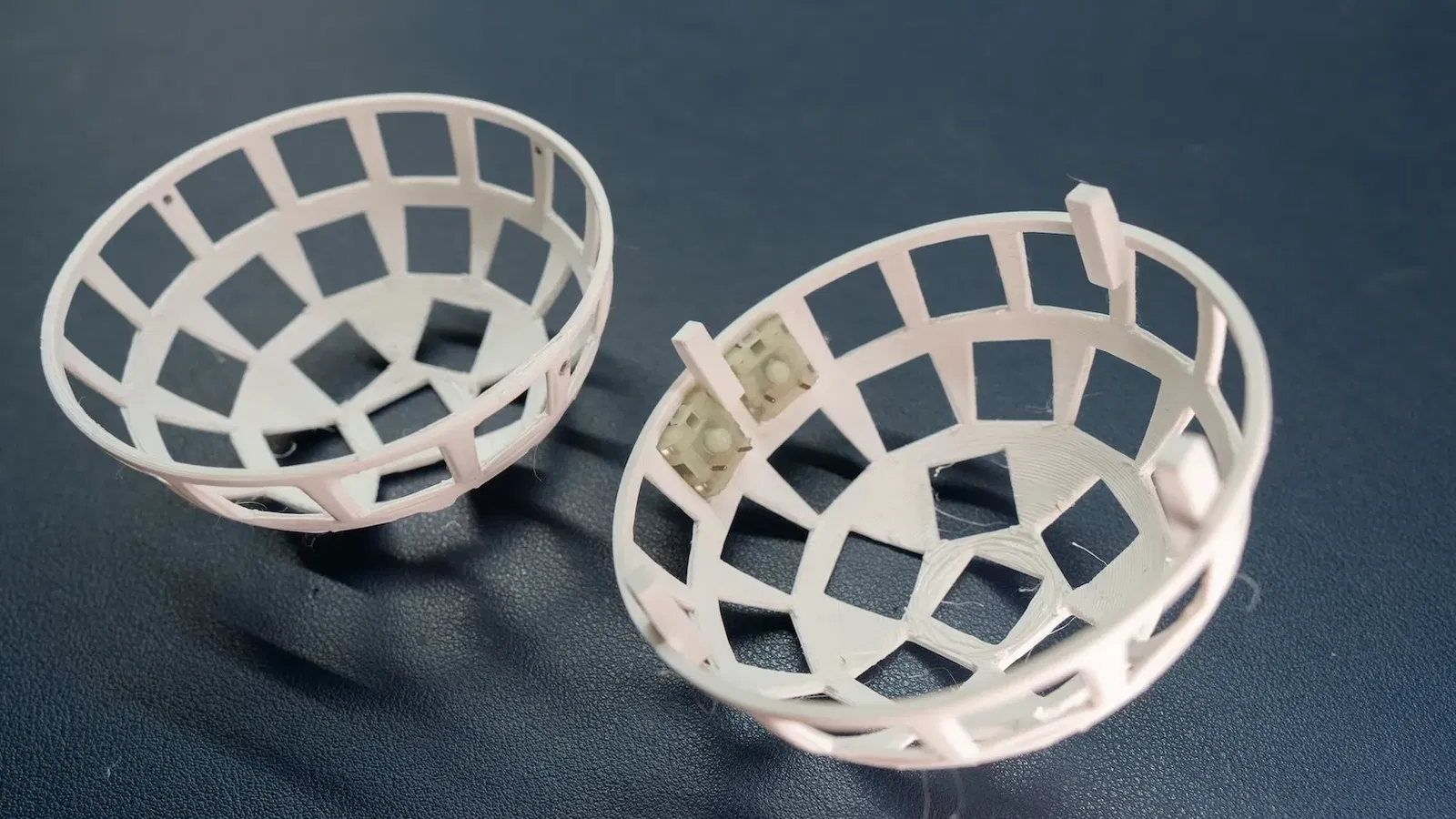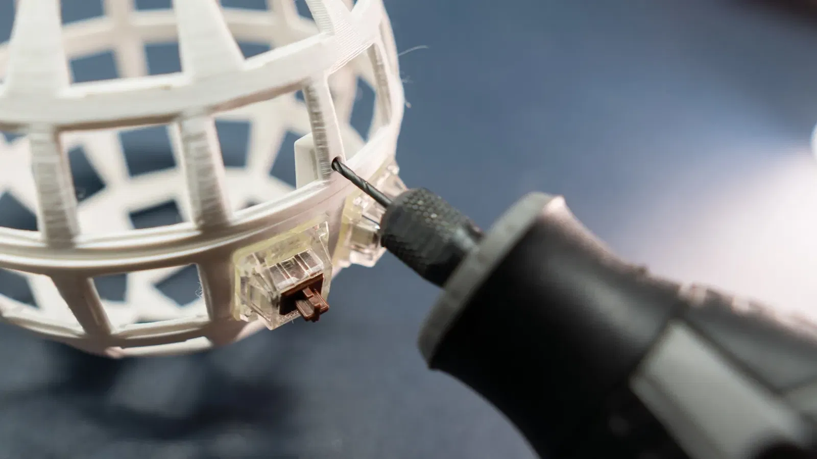 Đây là bàn phím hình cầu Bluetooth và chuột không dây với công tắc cơ học kích thước đầy đủ và ESP-32. Để gắn các mảnh lại với nhau. In 4 giá đỡ. Dán chúng như trong ảnh. Sau đó khoan các lỗ nhỏ cho ốc vít (ảnh). Kết quả trong video: