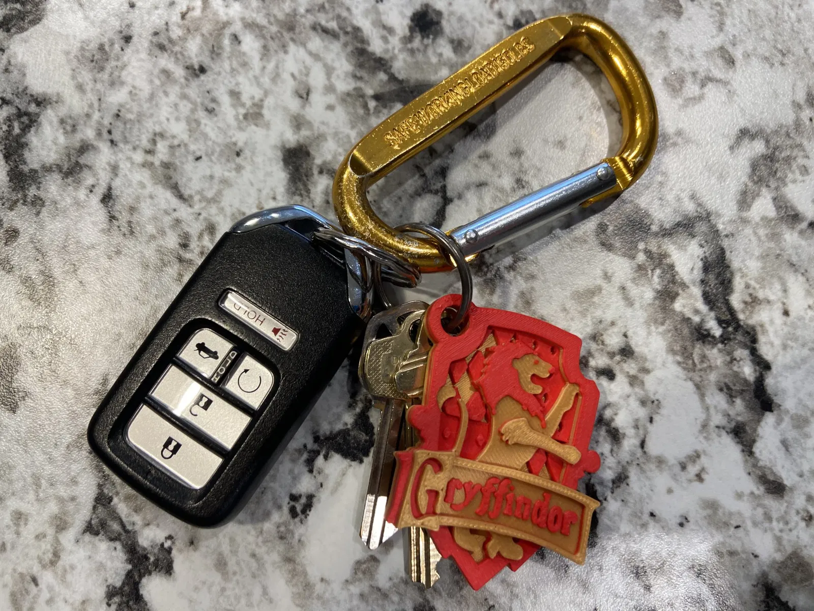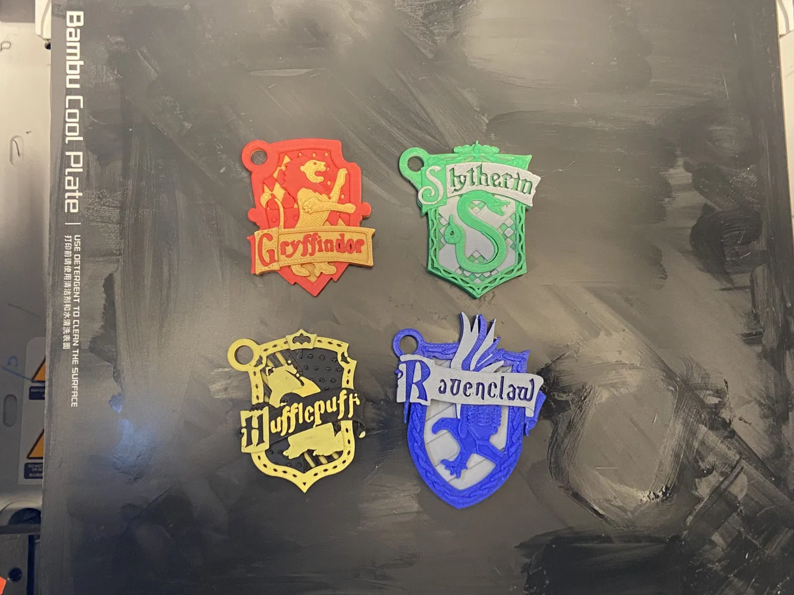 Biểu trưng nhà Hogwarts được biến thành móc khóa. Tất cả các móc khóa đều được in với nhiều lớp màu thay đổi, nhưng có thể được in mà không có bất kỳ thay đổi màu sắc nào. Các thay đổi màu sắc được lưu trong tệp .3mf, nhưng nếu bạn đang thực hiện các thay đổi lớp thủ công, các thay đổi diễn ra ở các chiều cao lớp sau khi in với chiều cao .2mm: