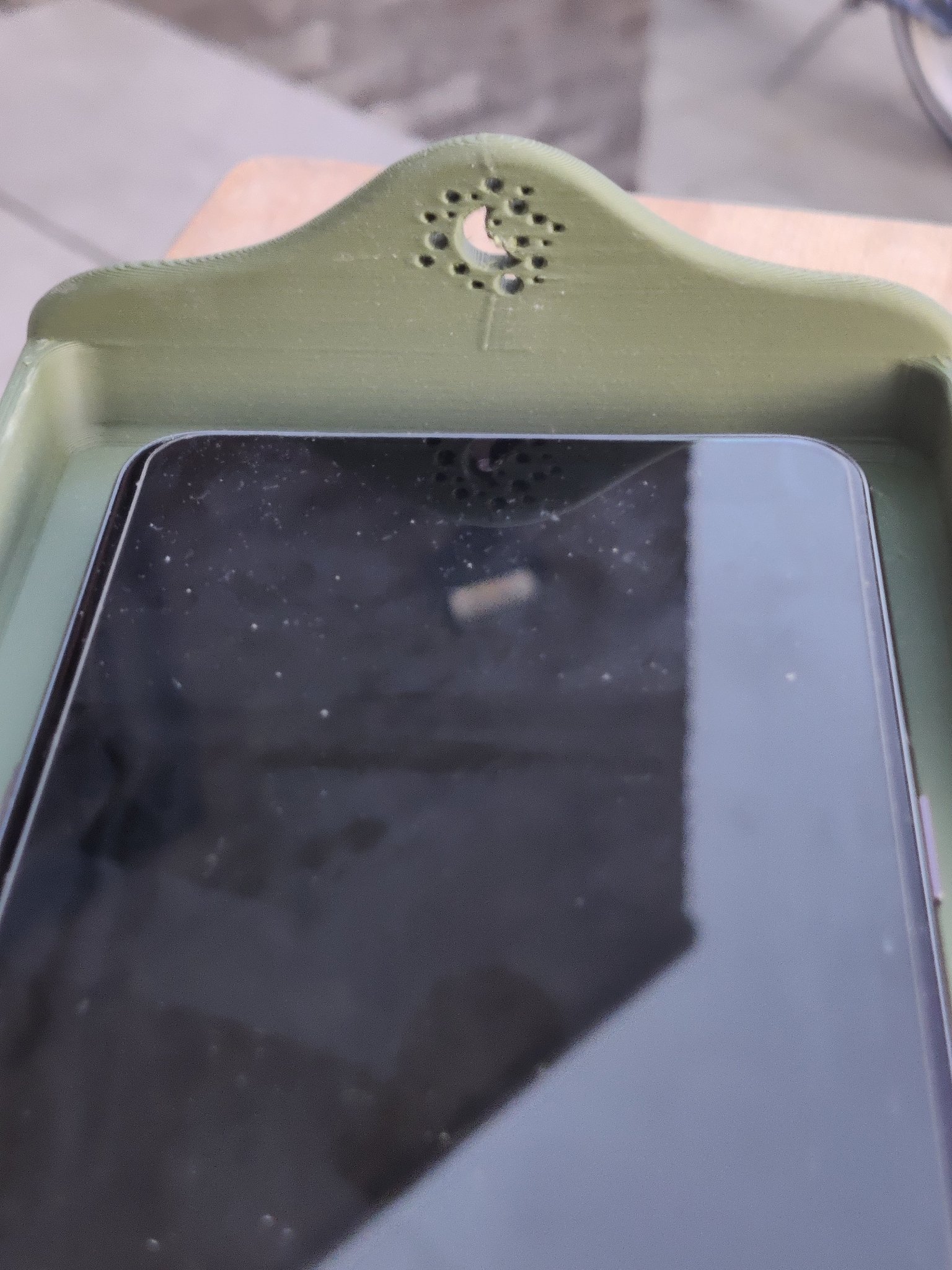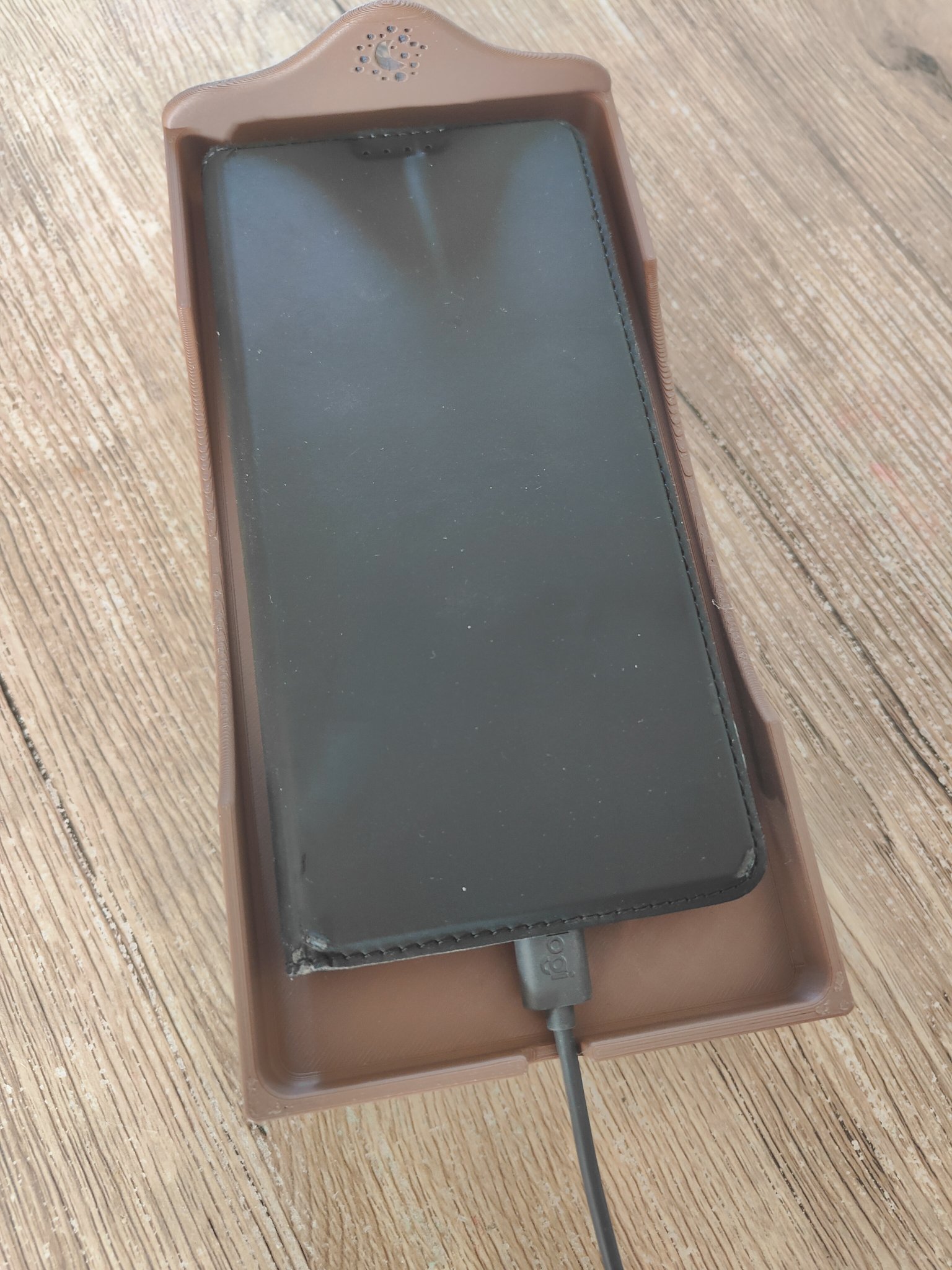 Nó đủ lớn để chứa hầu hết các kích thước điện thoại thông minh và có một lỗ nhỏ cho sạc.
