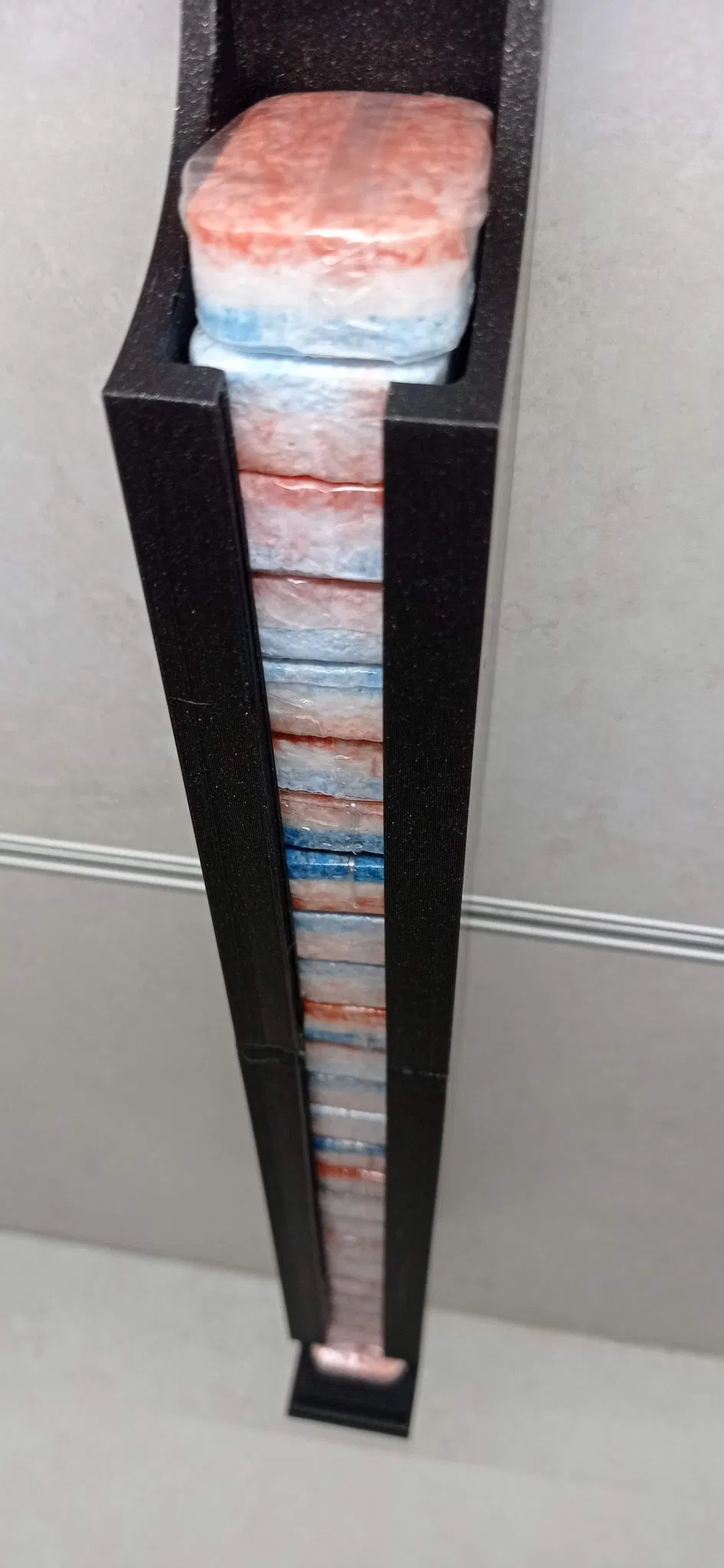 Bên trong có các khe trượt và cắt bên giúp dễ dàng kéo ra một viên trong khi các viên còn lại trượt xuống mà không bị kẹt.