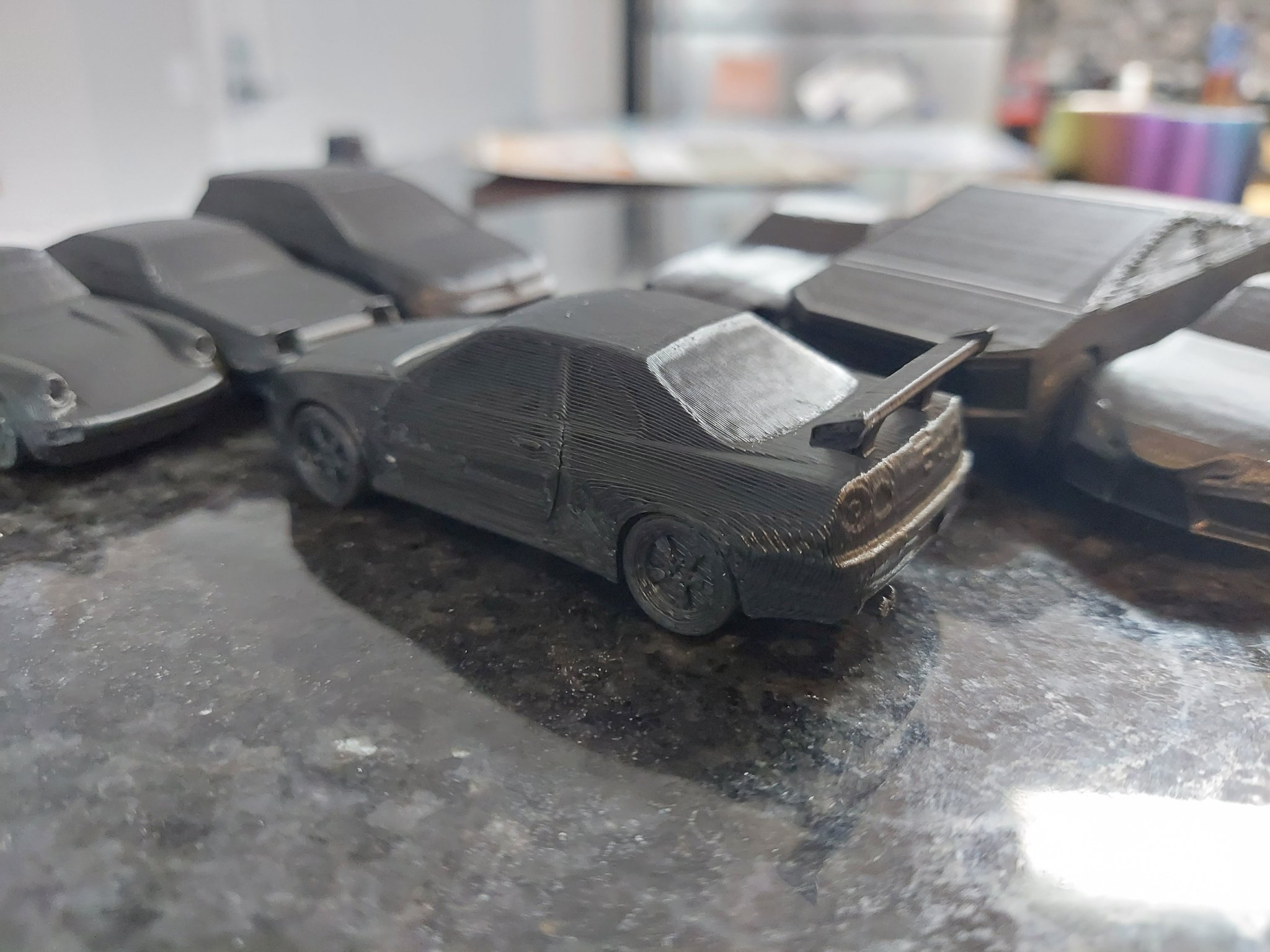 Tôi đã phối lại mô hình GTR Skyline Nissan để in ở phía bên của nó với các bánh xe và trục được tích hợp.