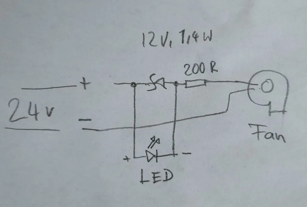 Tôi sẽ thêm một bản phác thảo nhỏ về cách đấu dây để làm cho nó dễ hiểu hơn. Một điều quan trọng cần nhớ là, quạt nên tiêu thụ dòng điện nhiều hơn LED, nếu không thì mạch sẽ không hoạt động như mong muốn và quạt sẽ thấy hơn 12 Volt. (Đó là một vấn đề với quạt Noctua 4020) Nếu bạn không cảm thấy tự tin về điện tử, hãy tìm ai đó biết, hoặc đừng thực hiện sửa đổi này, dù sao đi nữa, tôi không chịu trách nhiệm nếu nhà bạn bị cháy.