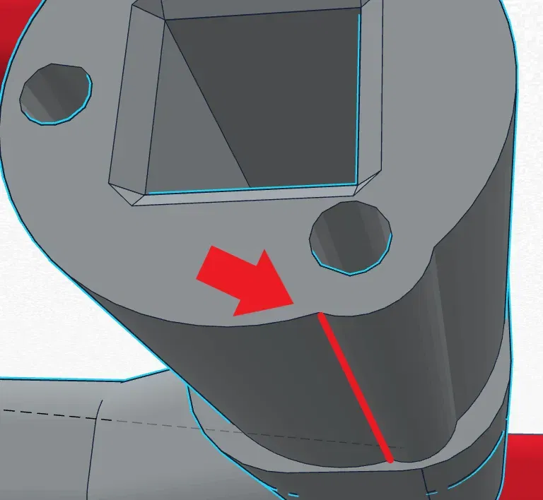 Nhược điểm chính là hỗ trợ cần thiết và lượng dọn dẹp sau in. Chủ yếu ở phần trục chèn vào đế cần điều khiển. Có một rãnh bên cạnh lỗ vít in ở dưới và cần phải cắt/giũa ra để vừa. (xem hình ảnh thứ ba)