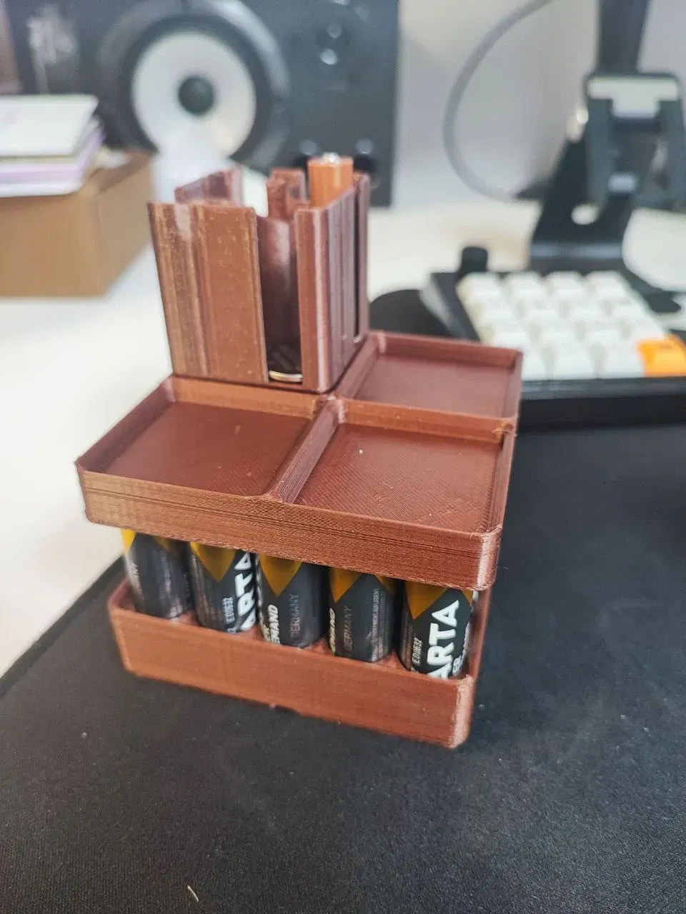 Điều này làm cho kho lưu trữ pin AA 2x2 từ Dalkin có thể xếp chồng lên nhau. Đây không phải là một khay lưu trữ nhưng làm cho nó có thể xếp chồng bằng cách thêm lưới Grdifinit lên trên. #### Tính năng: - Chất liệu: Được chế tác từ vật liệu PLA bền lâu.