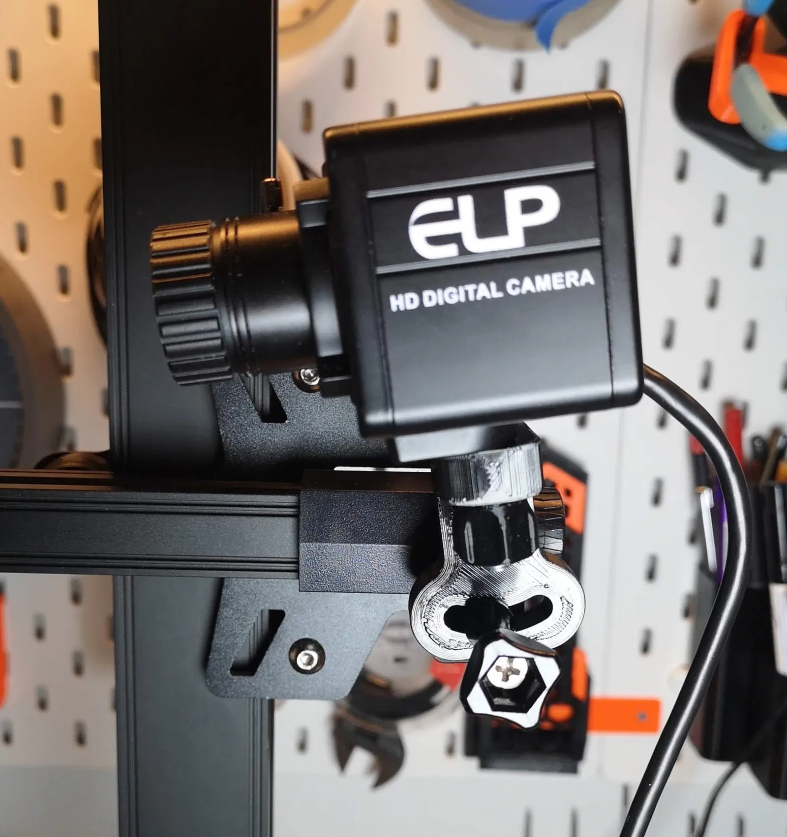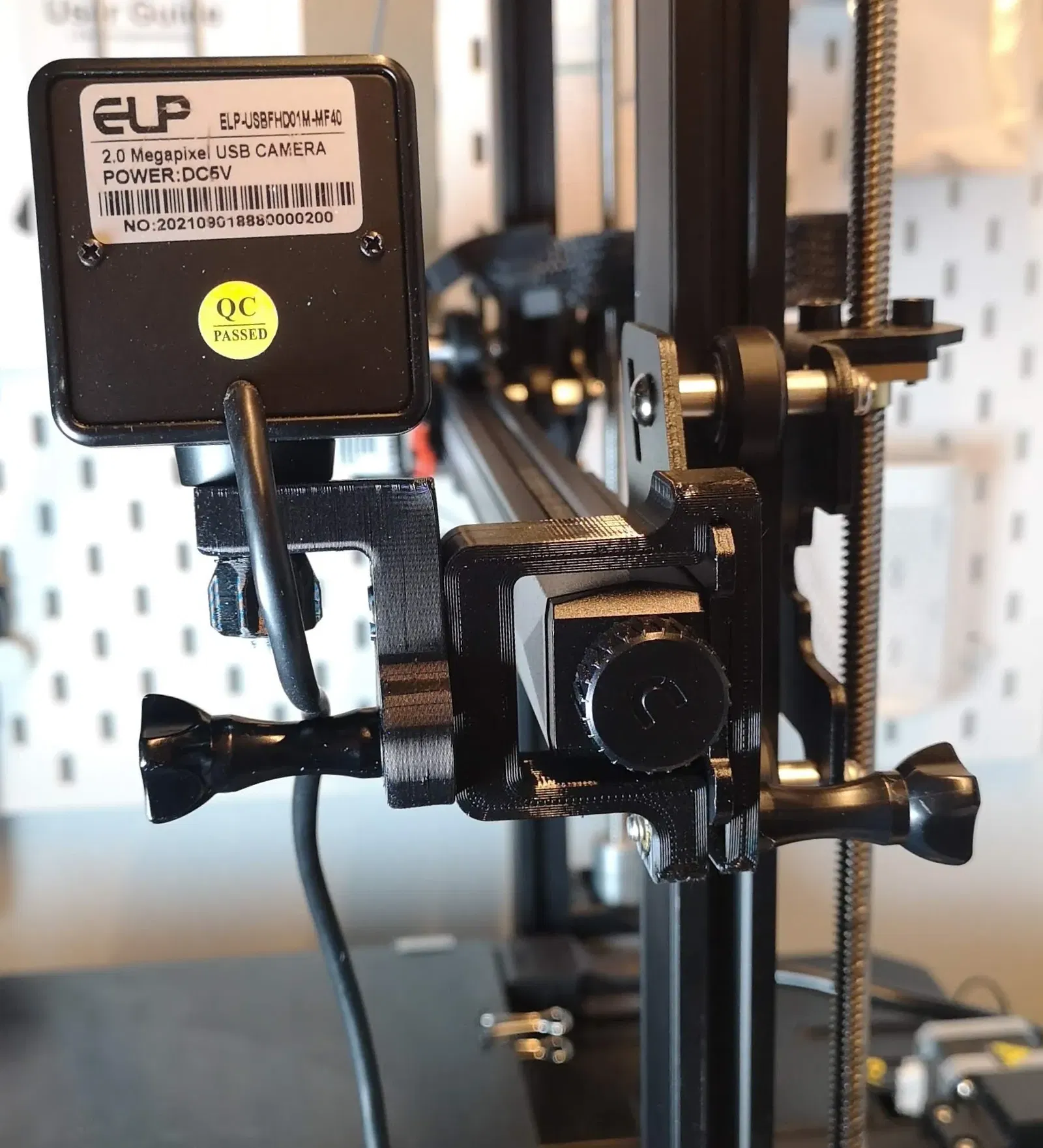 Hỗ trợ Webcam cho Ender 3 Trục X. Gắn vào đầu trục X. Điều chỉnh được cả hai hướng nghiêng và xoay. Dễ dàng lắp đặt và tháo gỡ, vận hành không cần dụng cụ với các ốc vặn tay. Phù hợp với mọi loại camera có ren gắn camera tiêu chuẩn M6. Tôi đã sử dụng 3 miếng chèn ren M5 để đảm bảo các ren bền. Tôi cũng đã chọn cách dễ dàng và sử dụng một vài ốc vặn tay GoPro mà tôi đã có sẵn. Ngoài ra, bạn có thể sử dụng các phiên bản in, như của RemiRafaels's