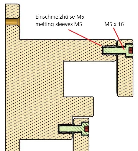 Ngoài ra, cần có 2 ống chảy M5 và 2 vít lục giác M5 x 16mm. Sau khi các ống chảy được lắp đặt, các vít sẽ được cố định cùng với "Sicherung 1". Để làm điều này, hãy sử dụng một ít chất giữ ren vừa phải và vặn các vít sao cho các chốt có thể di chuyển tự do. Theo cách này, chúng hoạt động gần như tự động.