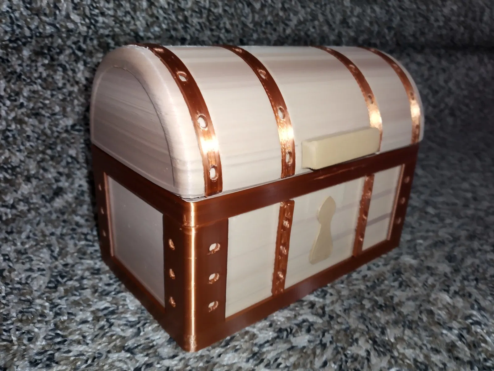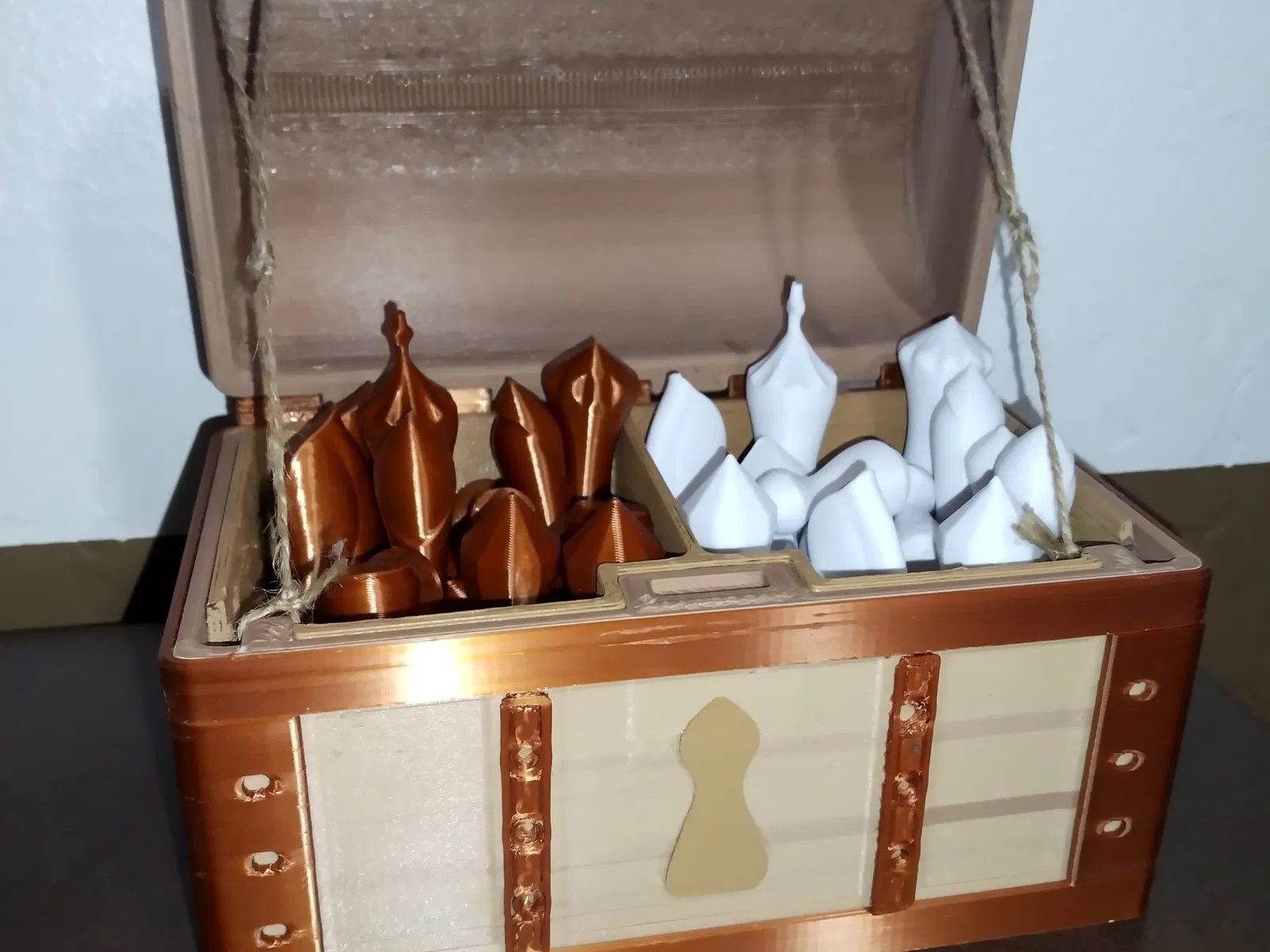 Một chiếc rương bằng gỗ và kim loại theo chủ đề cờ vua, với các ngăn cho hai đội cờ. ### Mục đích Tôi yêu những chiếc rương kho báu của muddymaker, và tôi cần một chiếc để lưu trữ Các quân cờ của mình. Nhưng một biến thể không chân với vẻ ngoài gỗ hơn phù hợp với sở thích của tôi và tôi nghĩ sẽ dễ dàng hơn cho tôi khi vận chuyển trên xe đạp. Vì vậy, đây là một CHIẾC RƯƠNG CỜ VUA! Tôi đã thêm một khay tùy chọn có hai ngăn. Trong những bức ảnh, nó đang giữ một bộ cờ Courier đầy đủ 48 quân (bộ 32 quân thông thường cộng với ). ### Sản xuất các bộ phận - Đối với các bộ phận “gỗ”, tôi sử dụng PLA “gradient gỗ” hai màu PolyTerra™. Ngoài ra, một người có thể sơn những bộ phận này bằng Khuôn mẫu Vân gỗ của tôi.