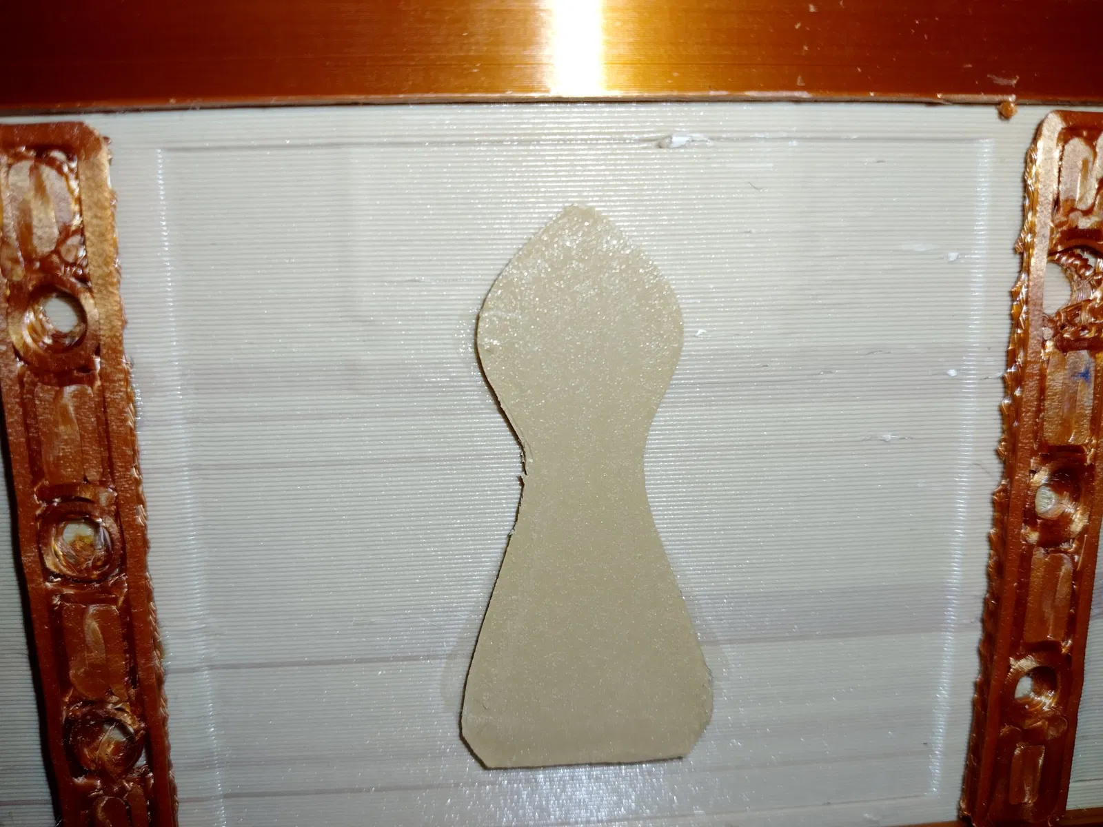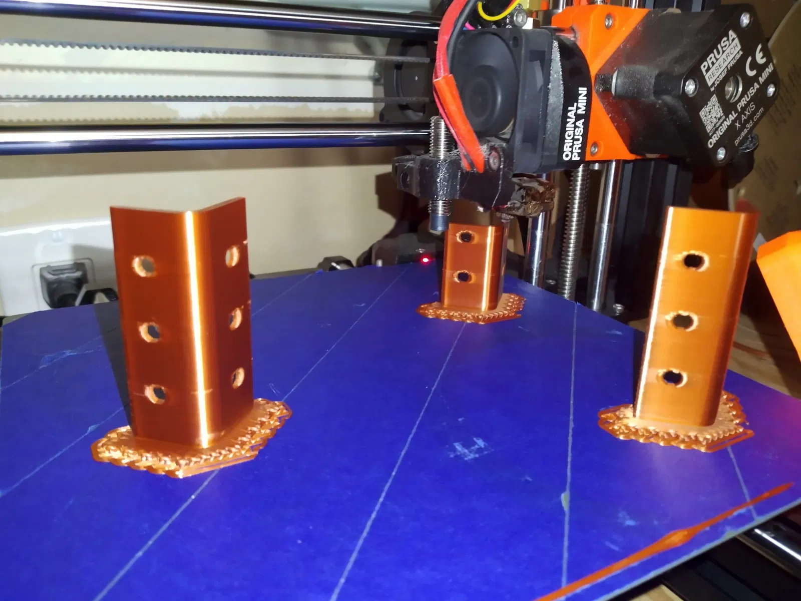 - Để cải thiện độ bám dính của mặt bàn: - Tôi in trên băng dính xanh. - Tôi in một lớp bè dưới các bộ phận góc. - Tôi in một viền quanh tất cả các bộ phận “kim loại” khác. ### Lắp ráp 1. Nhấn phần trang trí kim loại lên hộp.