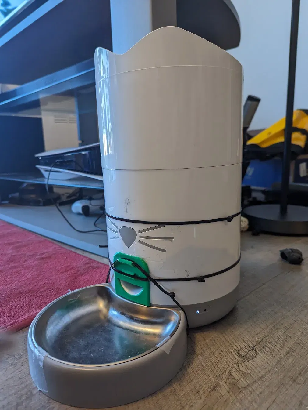 Một dây zip khác giữ cái đĩa xuống theo chiều dọc vì con mèo của tôi cũng sẽ đẩy cái máng đi. Điều này sẽ khiến bát thức ăn rơi ra, vì vậy tôi đã khoan một vài khe vào bát và gắn một dây zip giữa đó và cái đĩa che để đảm bảo rằng nó không thể lấy bát ra.