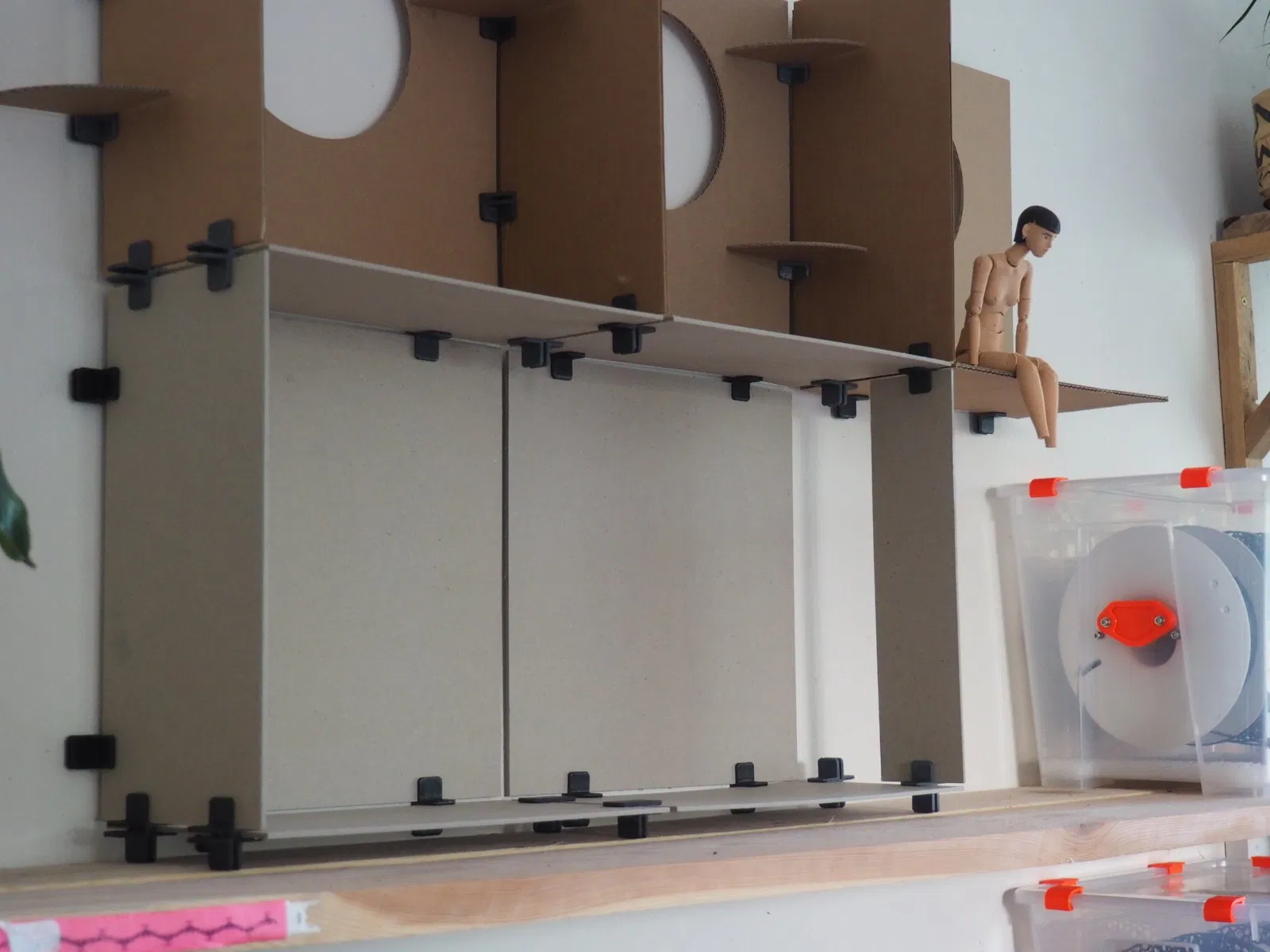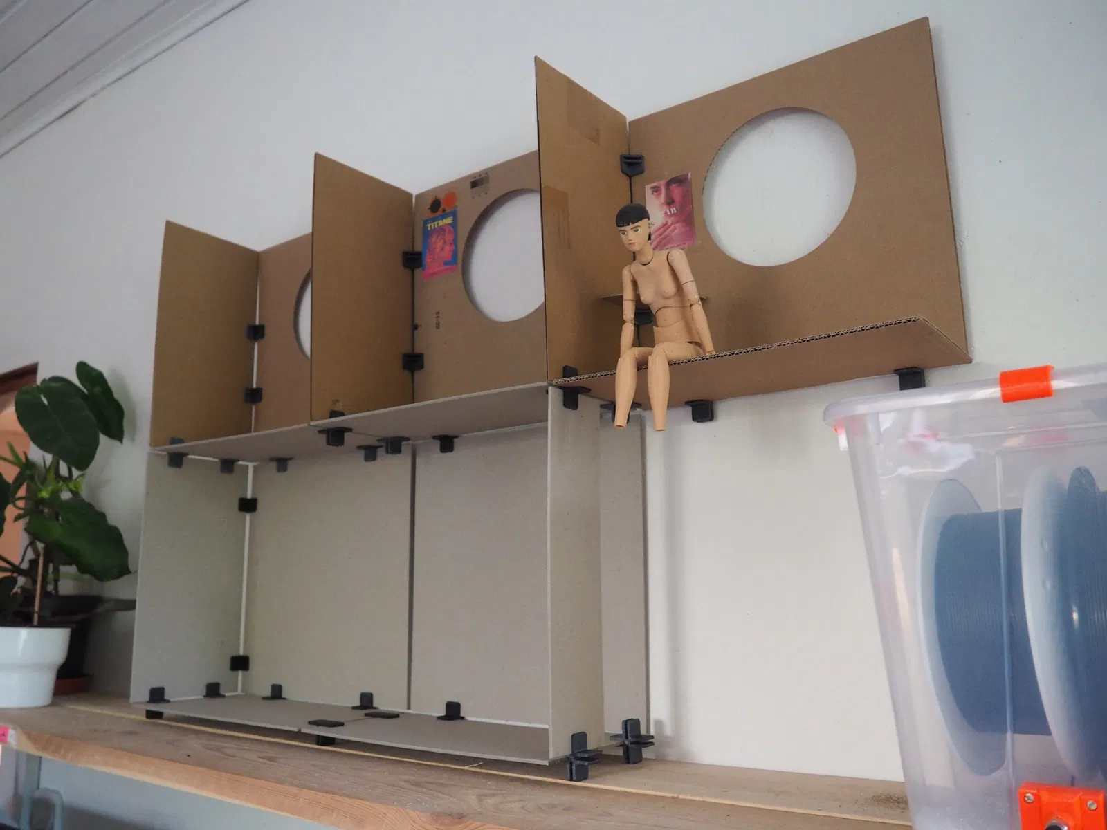 Tôi thiết kế búp bê in 3D và muốn tạo ra một ngôi nhà búp bê hiện đại để trưng bày chúng. Ý tưởng này được lấy cảm hứng từ Nakagin Capsule Tower. Khái niệm này đã dẫn tôi đến việc thiết kế một ngôi nhà búp bê mô-đun linh hoạt. Nó là một cấu trúc có thể mở rộng, có thể dễ dàng được lưu trữ khi tháo rời. Tôi đã thiết kế ba loại khớp nối để kết nối các tấm bìa cứng, thùng carton hoặc ván ép dày 3 mm.