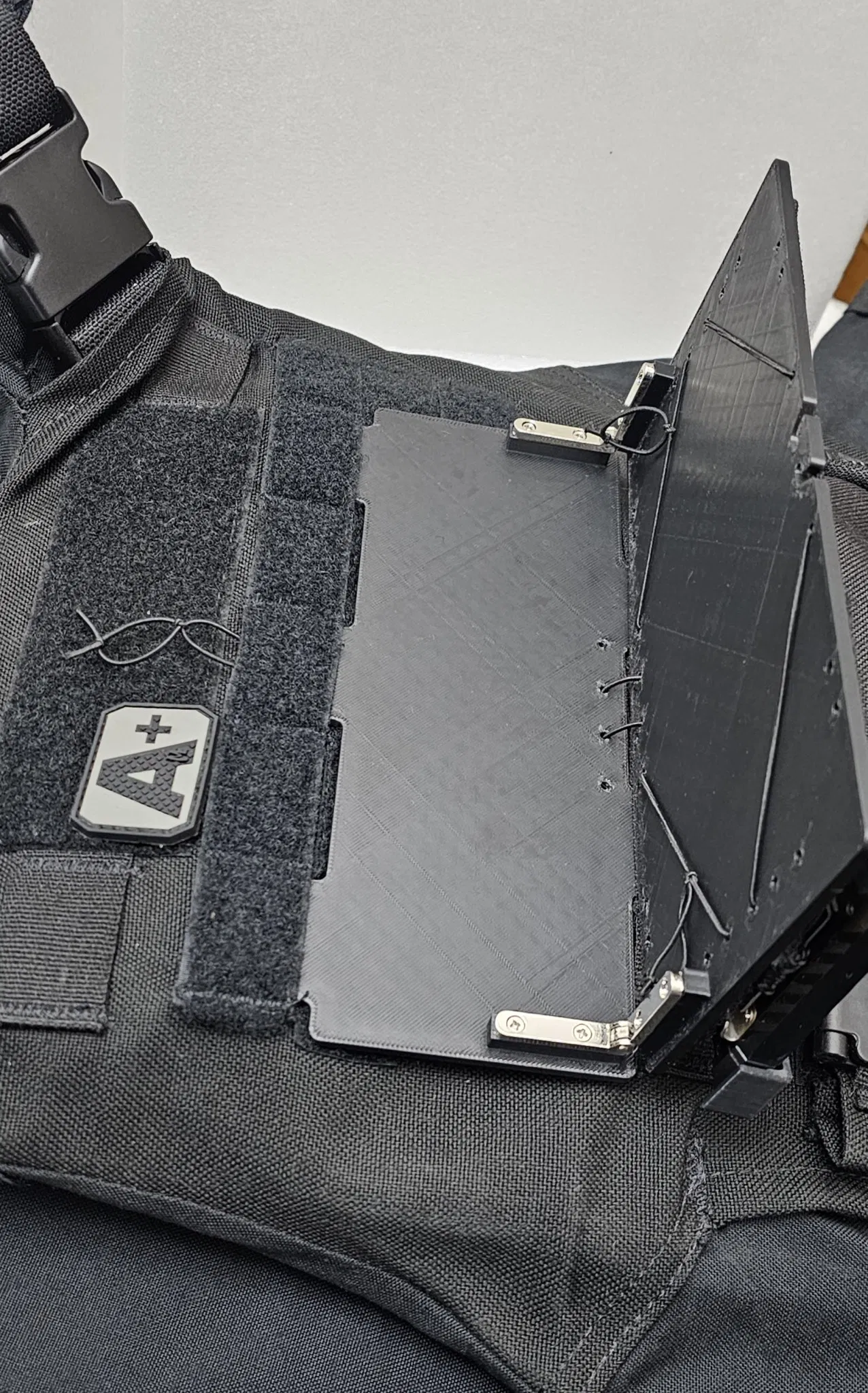 Vỏ này gắn vào các giá đỡ Molle trên một chiếc áo vest, để điện thoại của bạn có thể lật xuống để dễ dàng xem. In thành hai phần và sử dụng bản lề của thợ kim hoàn để tăng cường độ bền và độ tin cậy (so với bản lề in yếu hơn). Điện thoại được giữ chặt bằng dây thun 1.2 mm. Dây thun cũng được luồn quanh tấm molle và xuyên qua dây đai molle để giữ cho bản lề đóng lại khi không sử dụng. Mặt sau có thể dán velcro cho các miếng vá hoặc các phụ kiện khác.