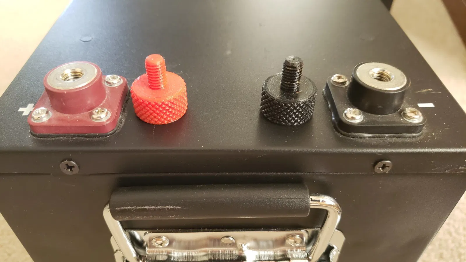 Có một cái với ký hiệu dương và một cái với ký hiệu âm để giữ chúng đúng vị trí. Tôi đã làm rãnh trên núm để dễ dàng vặn vào và ra bằng tay.