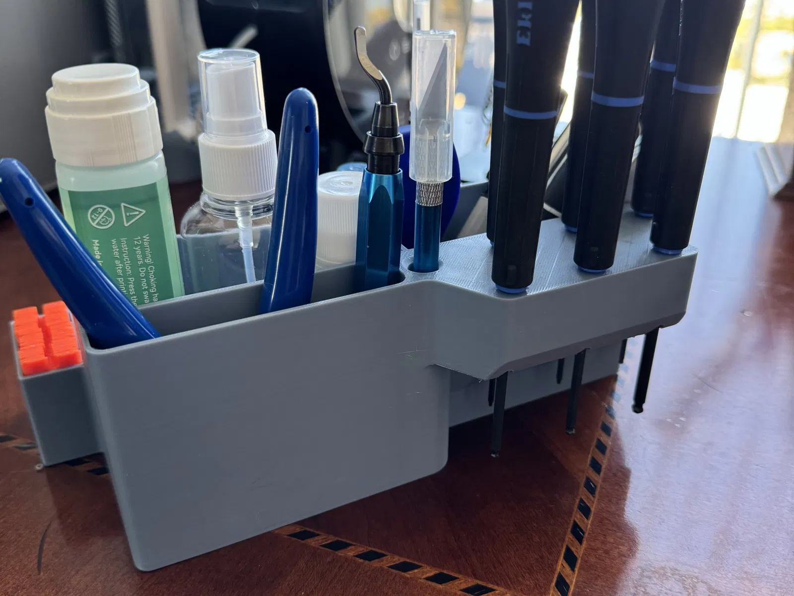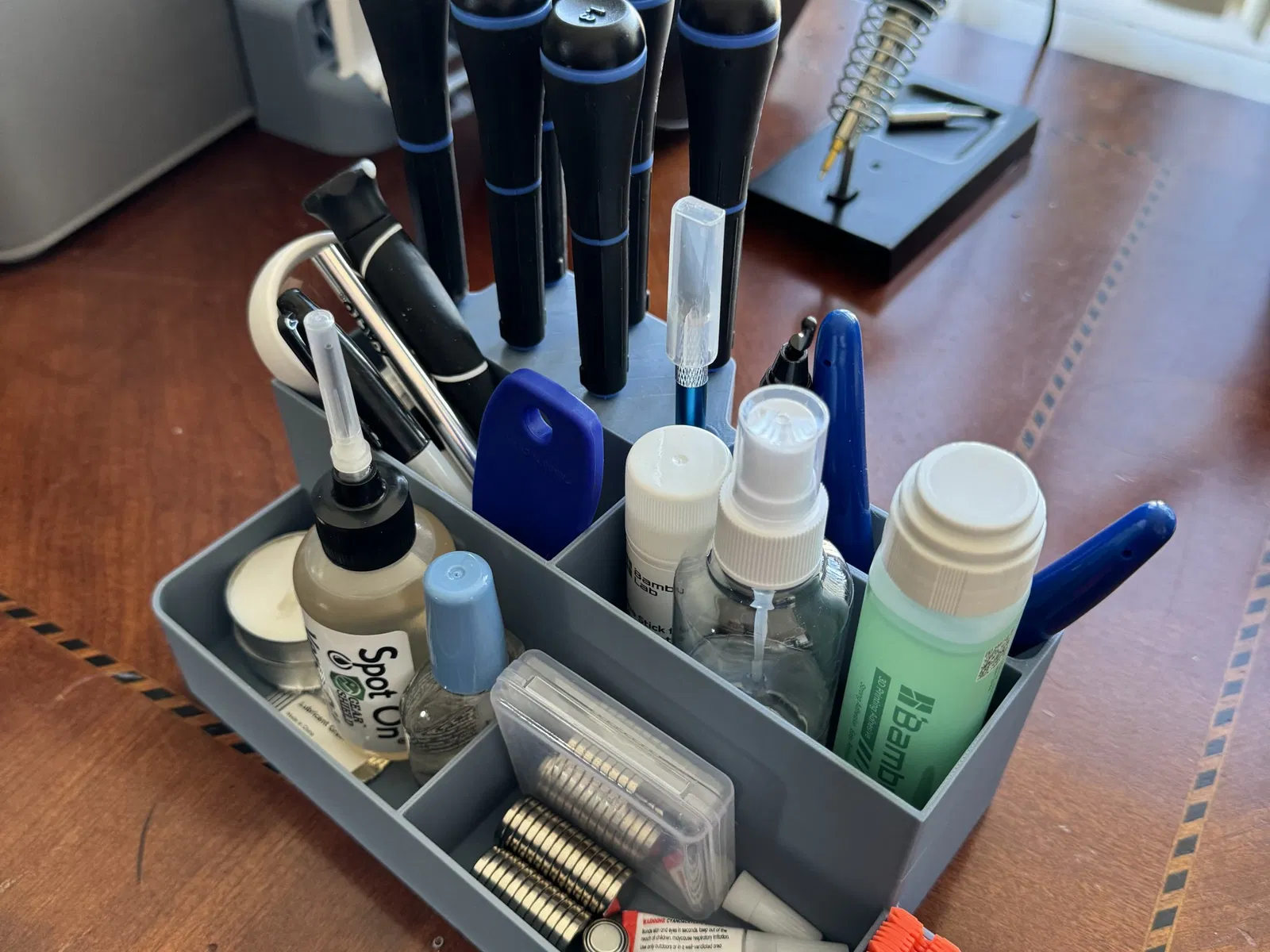 Tổ chức máy tính để bàn bao gồm các đốm để lưu trữ một bộ trình điều khiển hex, dao X-acto và lưỡi dao cạo bằng nhựa.