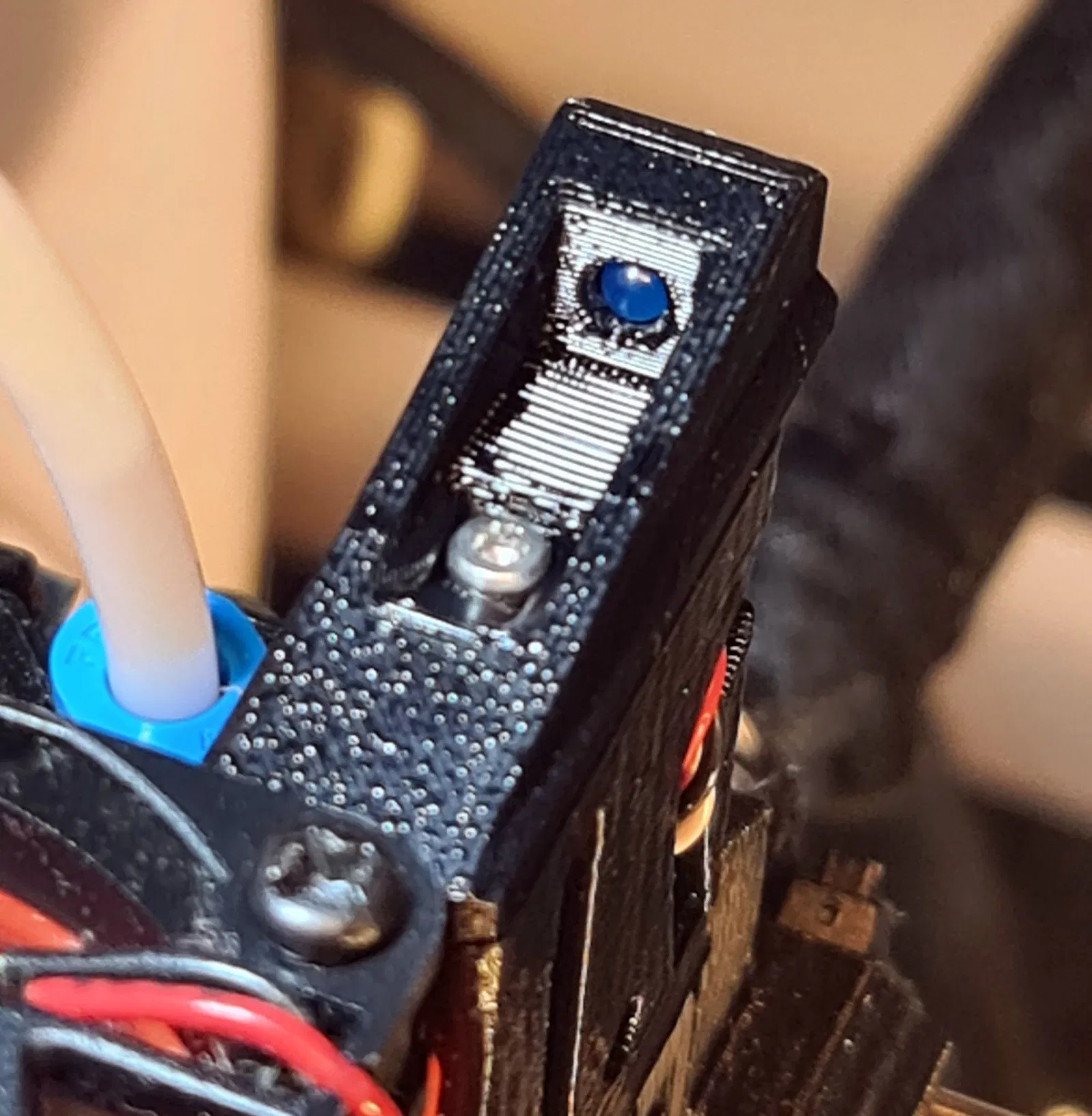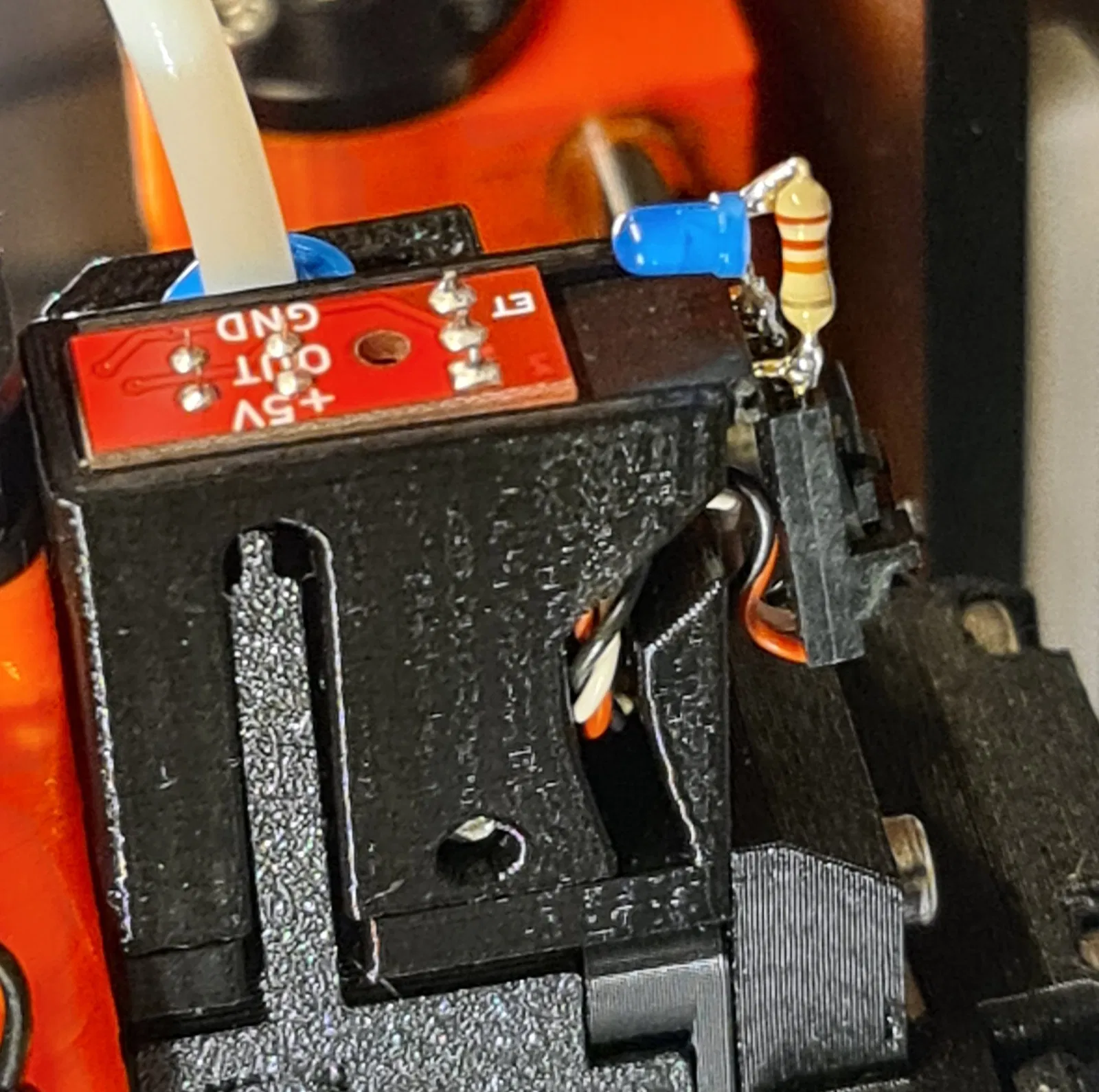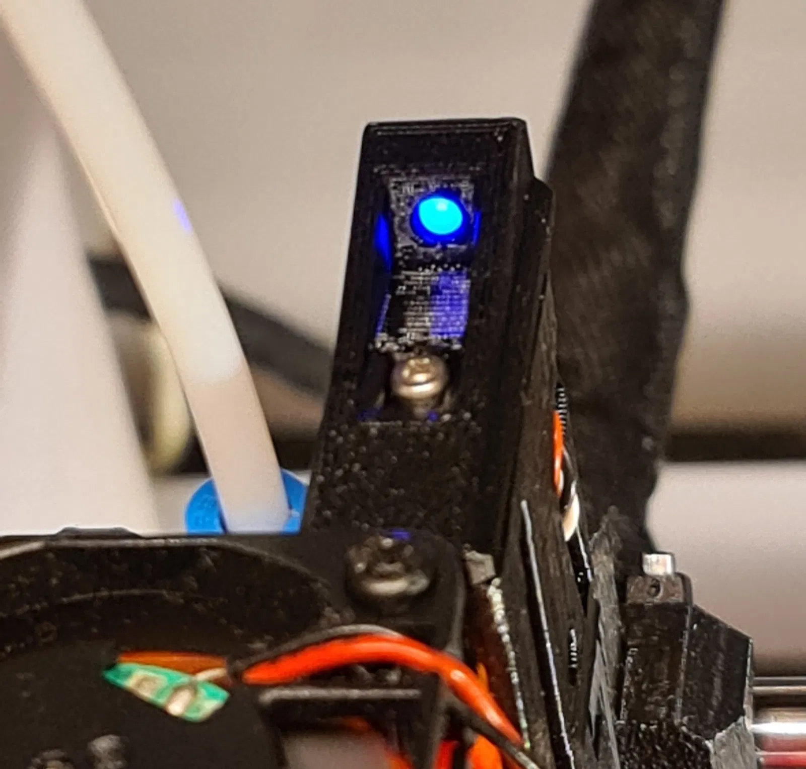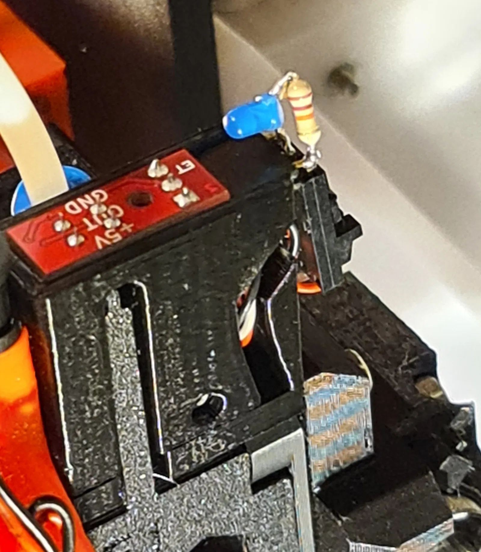 Vì tôi gặp vấn đề với vật liệu linh hoạt, tôi đã tìm kiếm các chỉ báo cho cảm biến filament. @Mykal451 có những giải pháp rất đẹp cho điều này. https://www.printables.com/de/@Mykal451_7969 Nhưng tôi không muốn hàn vào cảm biến gốc, và đặc biệt là không muốn các linh kiện SMD. Vì vậy, tôi đã sử dụng một LED 3mm có sẵn và chế tạo một điện trở 22K và một nắp ống khói mới. Tôi vẫn còn phích cắm ba chân trong đồ dùng thủ công của mình. Vì nó có các kết nối dài hơn, điều này đã hoạt động rất tuyệt vời. Cập nhật: Vì tôi sử dụng ánh sáng sáng ở bên phải của vỏ máy in, tôi đã thêm một phiên bản có tính năng chặn ánh sáng.