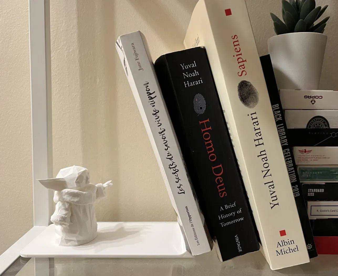 Đây là một giá sách cho thư viện của bạn, làm cho nó trông như Yoda đang giữ sách của bạn bằng sức mạnh. Vì các mô hình là riêng biệt và chốt giữ nhân vật ở vị trí nằm trên phần giá sách, bạn cũng có thể chỉ in Yoda như một tượng nhỏ.