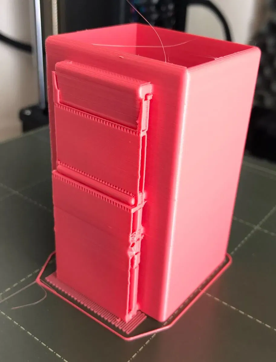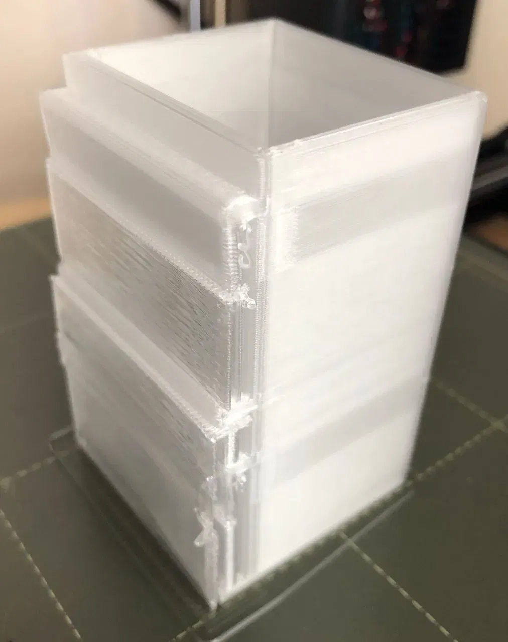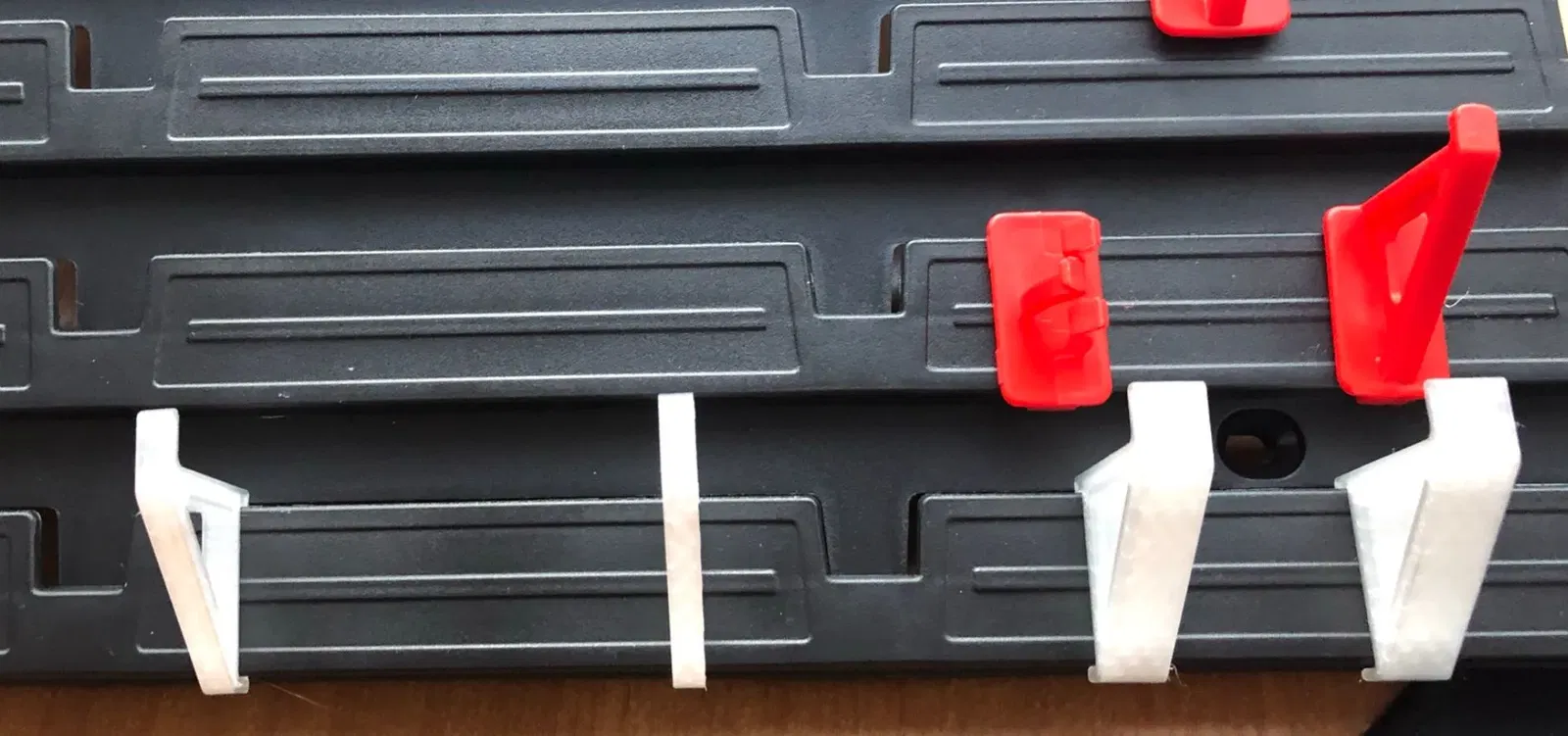 PETG là lựa chọn khôn ngoan vì các móc nên mạnh mẽ và có độ đàn hồi một chút cùng lúc. In với hỗ trợ (hộp). Chuẩn bị hai phiên bản của hộp - xem các móc khác nhau - nhỏ và dài.