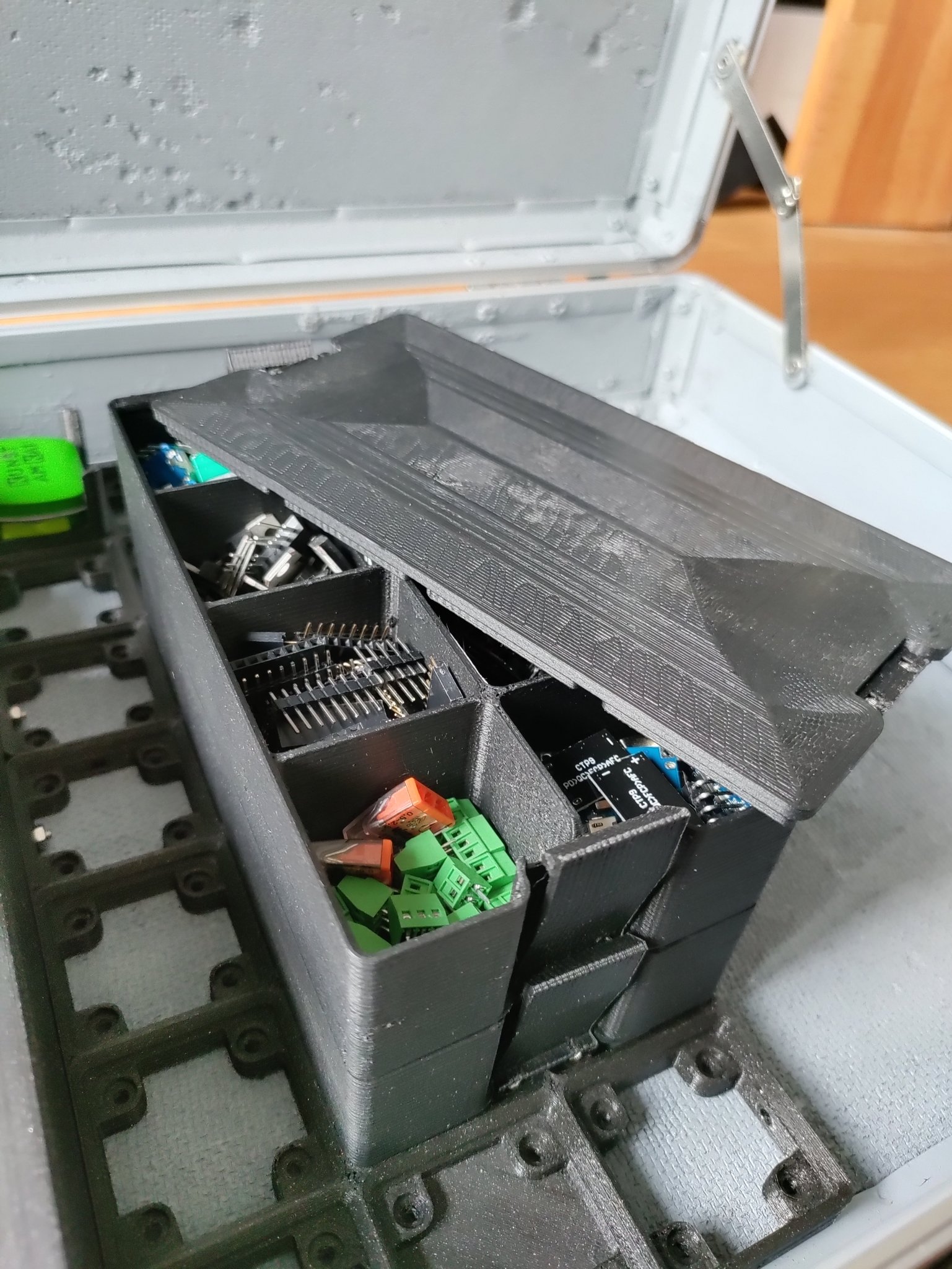 Một hộp phân loại Gridfinity 4x2. Nó có thể xếp chồng, nó có khóa và nếu các kẹp khóa bị mòn, bạn chỉ cần thay thế chúng, thay vì phải vứt bỏ toàn bộ hộp.