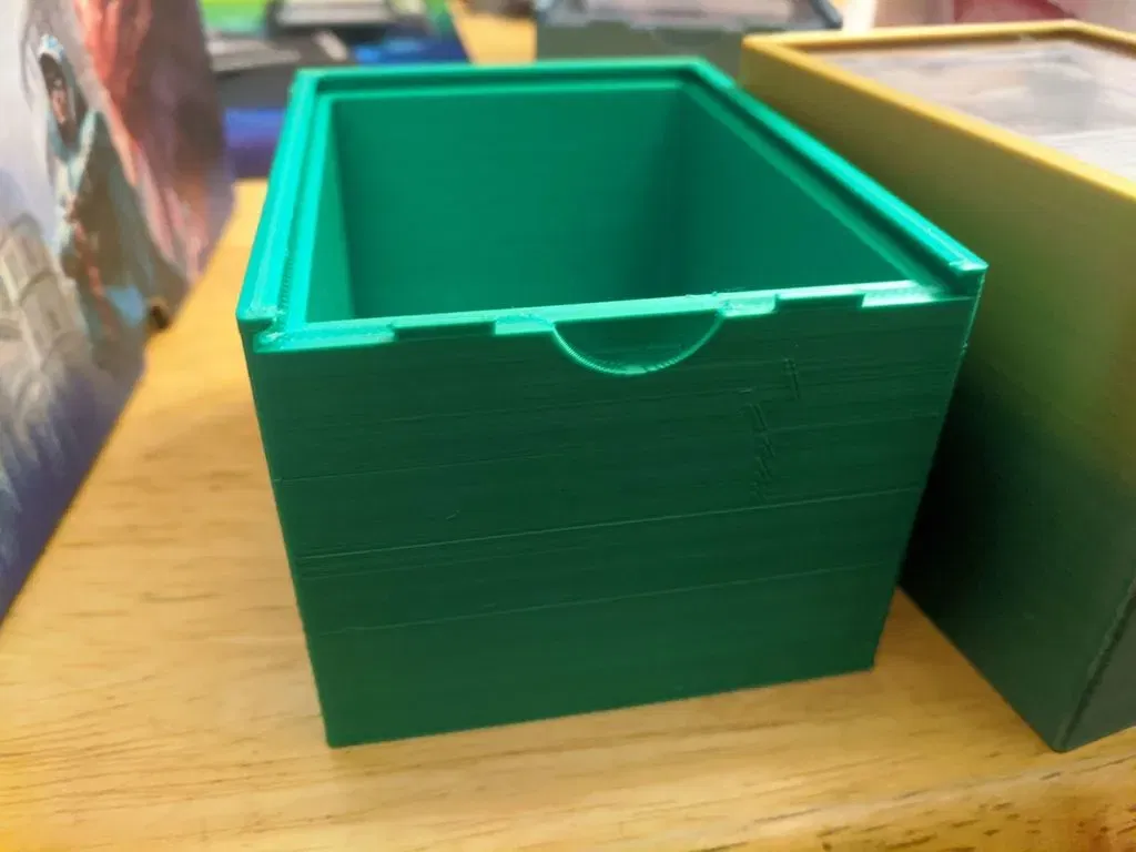 Tôi đã tải lên 2 ví dụ STL mà tôi đã in, một cái ngắn hơn có thẻ phải nằm úp/mặt lên (ví dụ màu xanh và xám) và một cái cao hơn có thẻ có thể nằm ngang hoặc úp/mặt lên (ví dụ đa sắc). Cả hai đều hoạt động với bộ bài EDH đã bọc của tôi (dragon shield và eclipse) và cả hai đều chứa một chút không gian thêm cho một số token. Tôi đã thấy tôi có thể chứa khoảng 5-10, tùy thuộc vào việc tôi muốn nhồi nhét bao nhiêu.