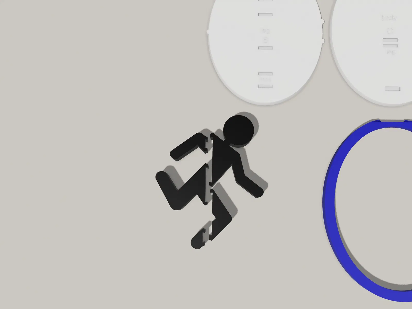 - Lắp cái hình người que cổng từ mấy bộ phận màu đen vô cái nền màu trắng. Hơi dùng lực chút xíu nha, nhưng nó sẽ khớp siêu ngon. Mỗi bộ phận hình người que có hai cái chốt, cắm một đầu vào theo góc rồi dùng lực ấn cái chốt còn lại vô.