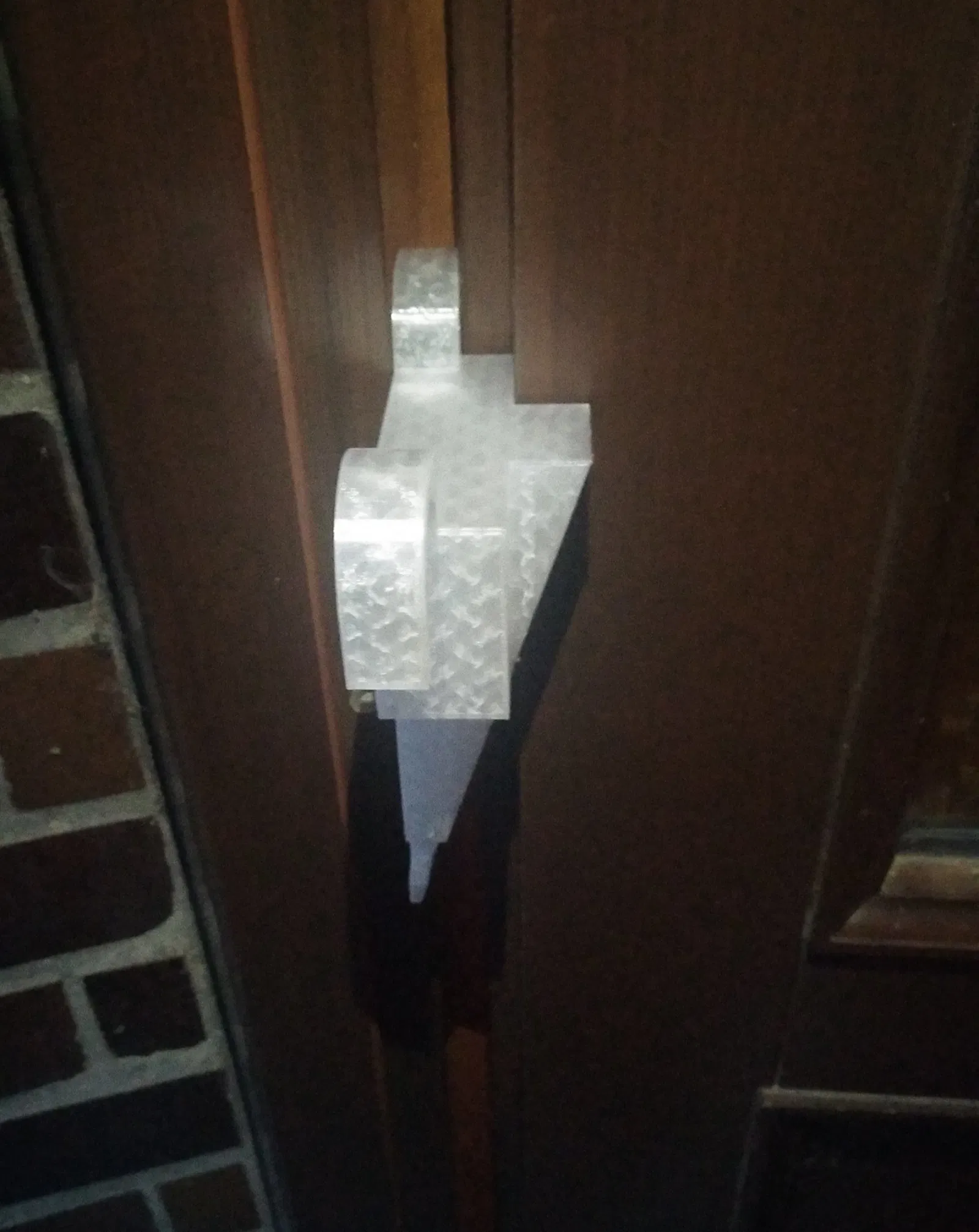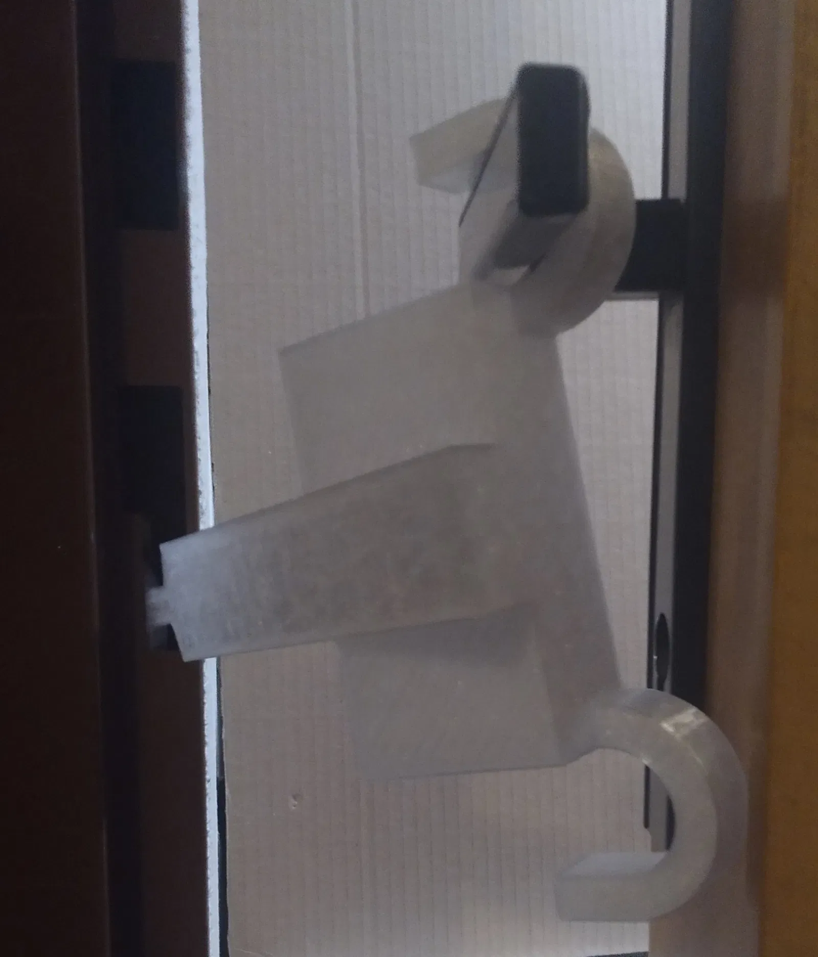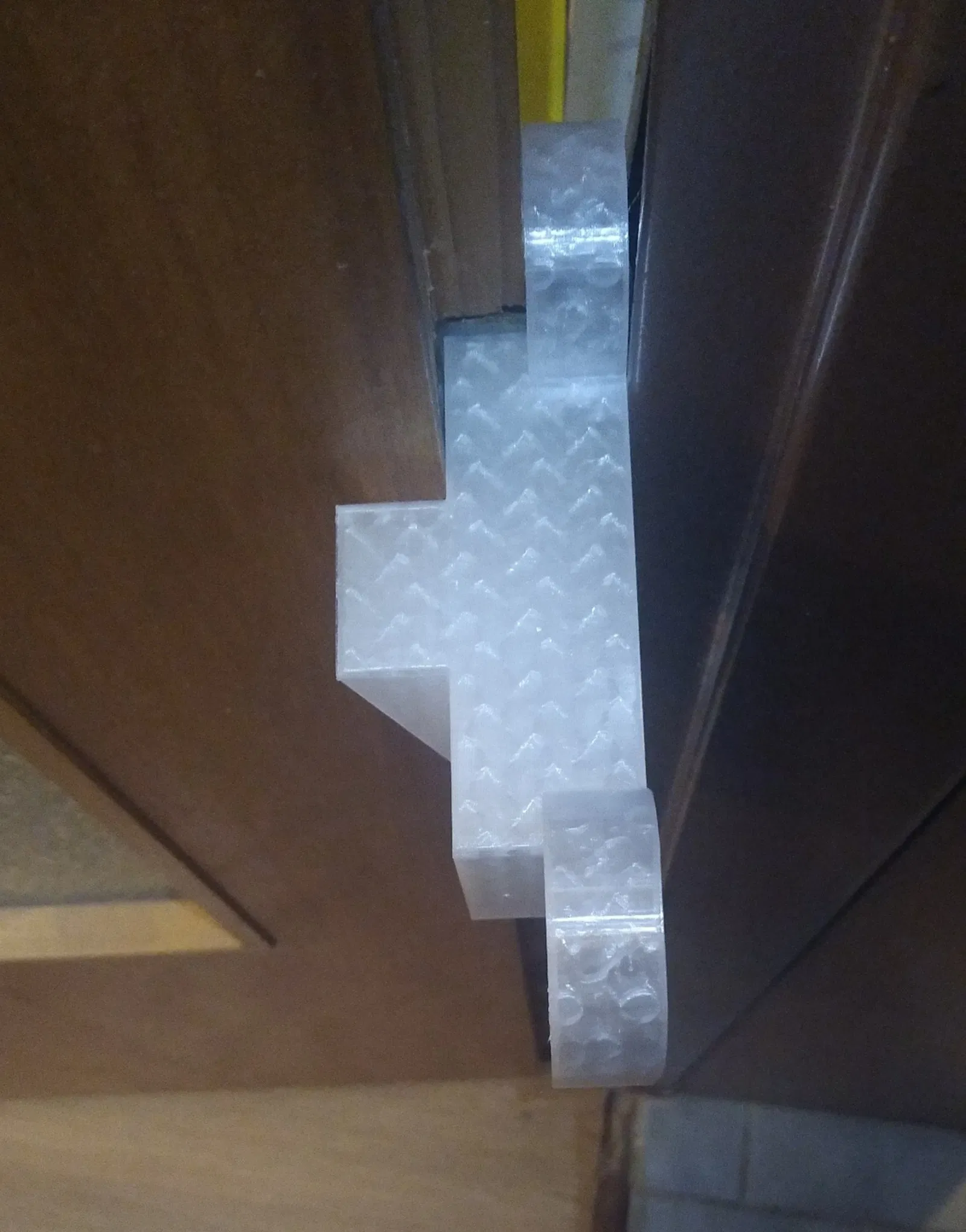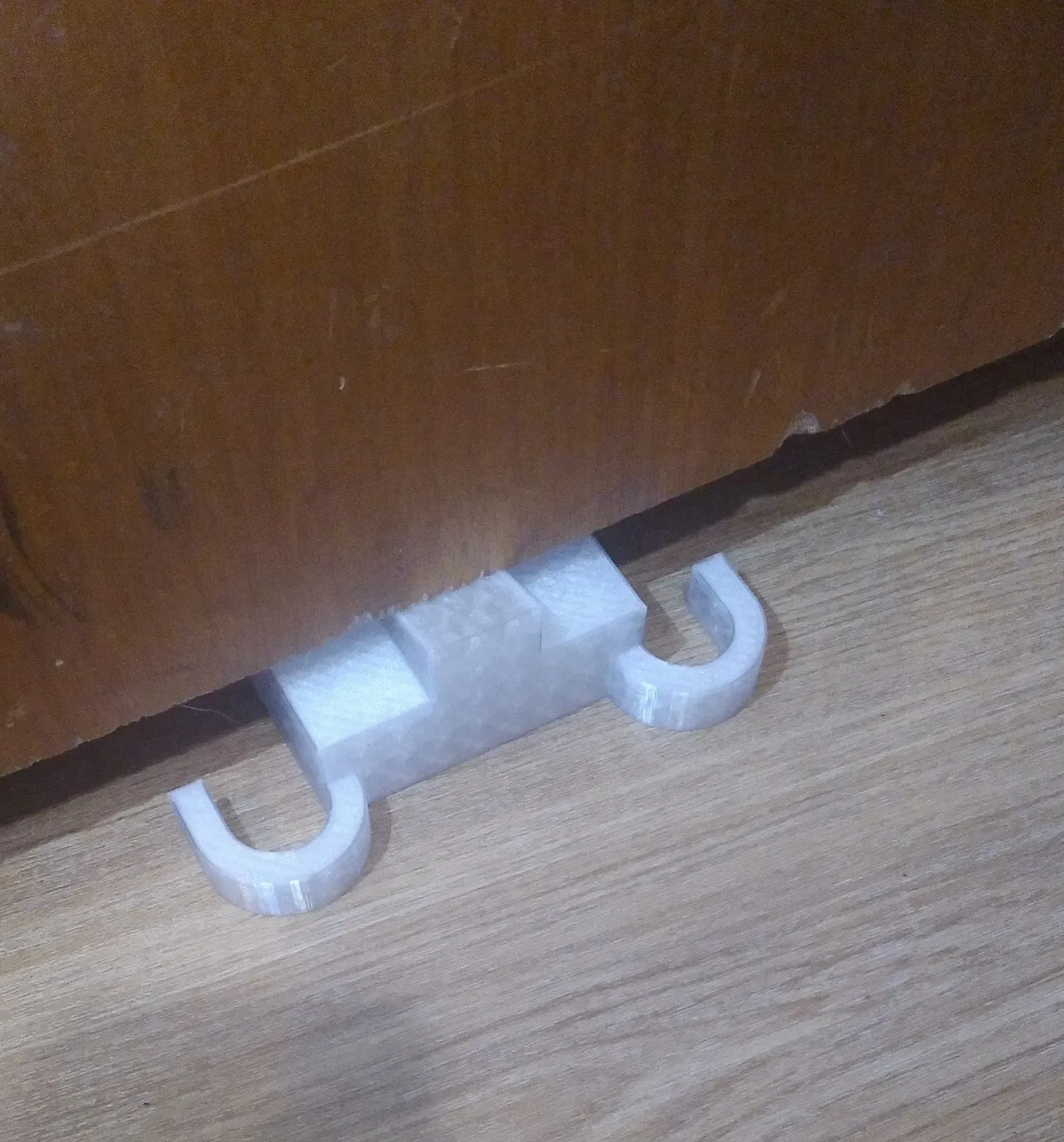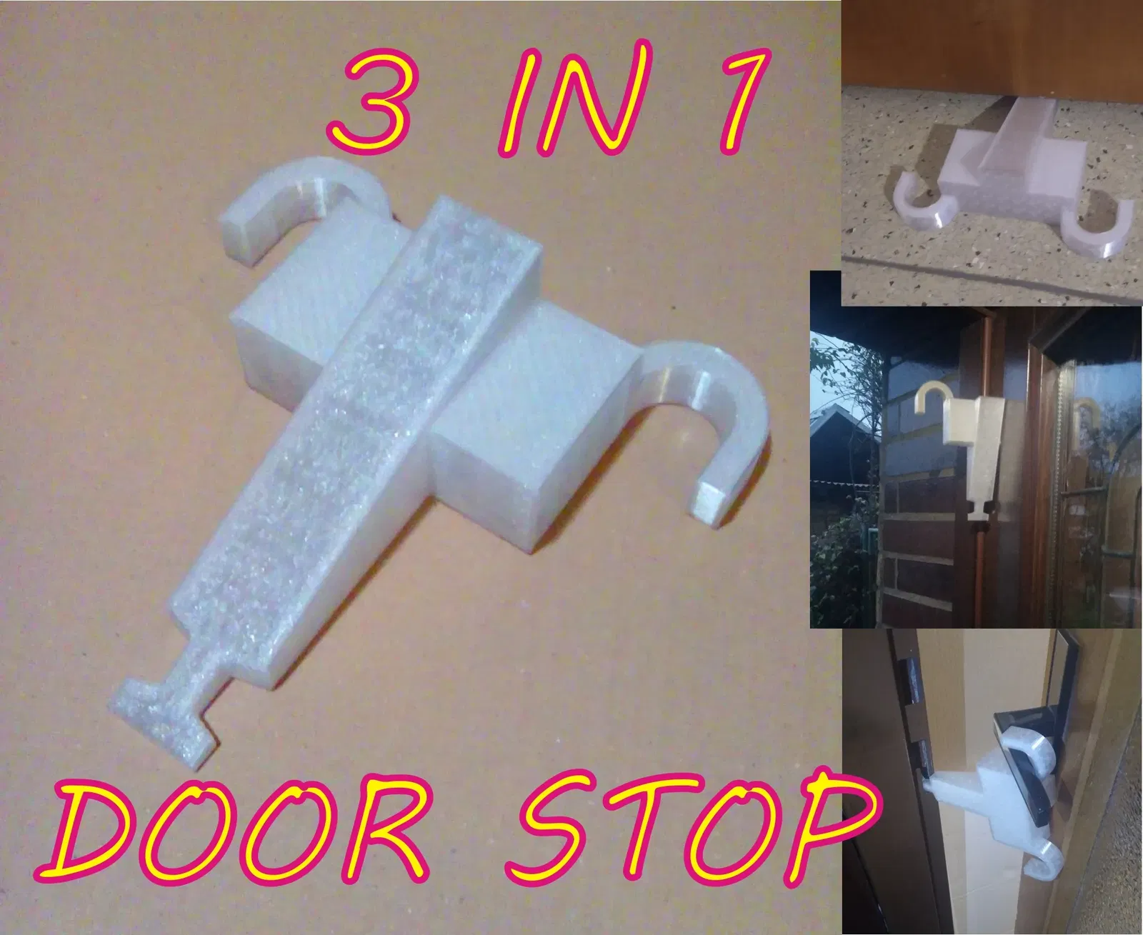 Dừng cửa 3 trong 1 có thể được sử dụng theo ba cách khác nhau: 1) miếng chêm tiêu chuẩn đặt dưới cửa 2) miếng đệm trong khe giữa cửa và khung cửa được gắn bằng móc trên bản lề cửa 3) cố định cửa đặt giữa tay nắm cửa và các lỗ trên khung cửa In mà không cần hỗ trợ.