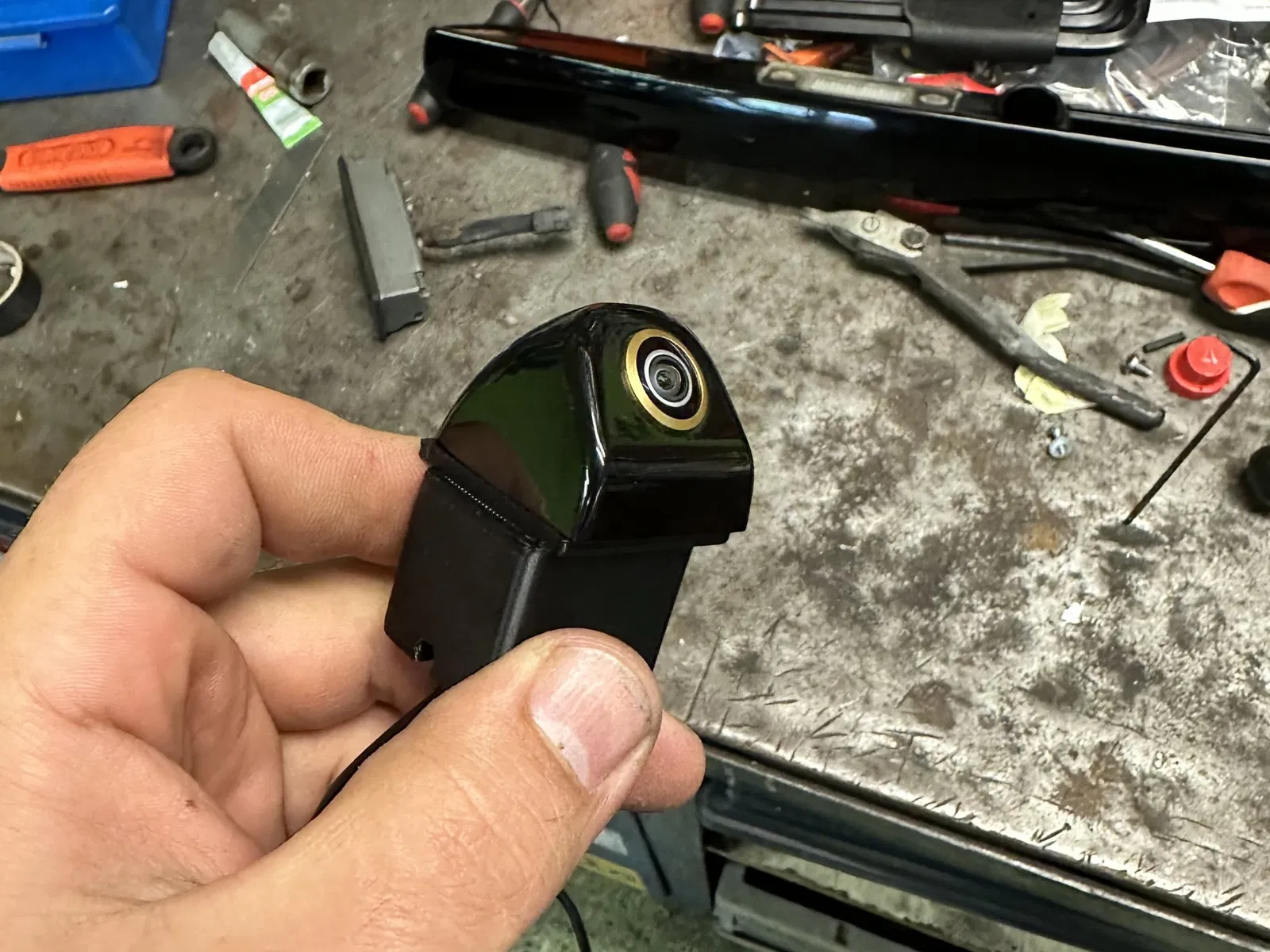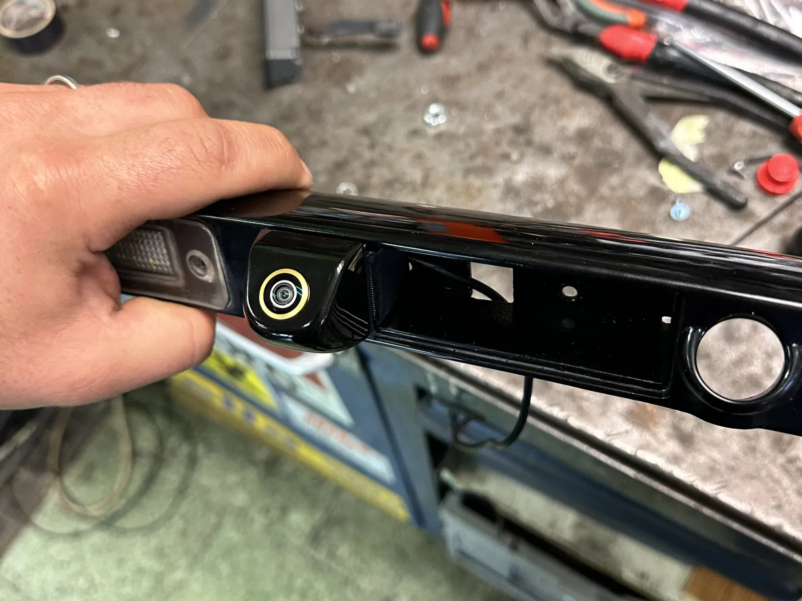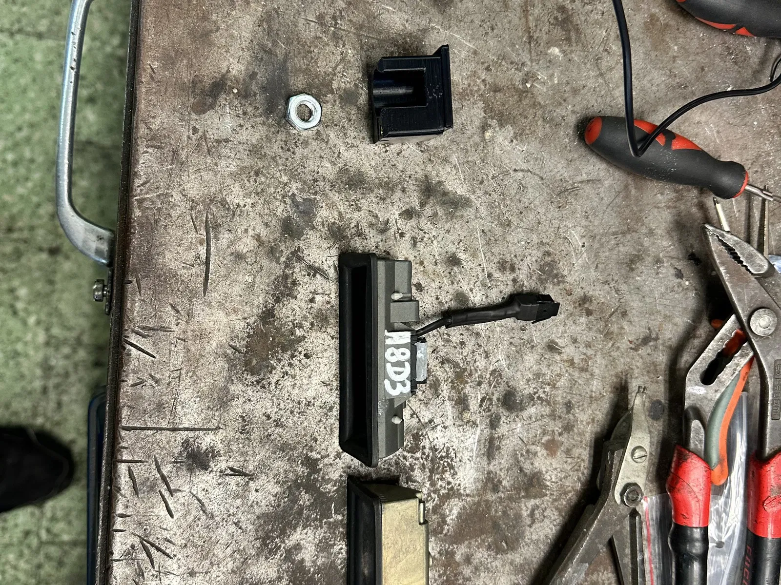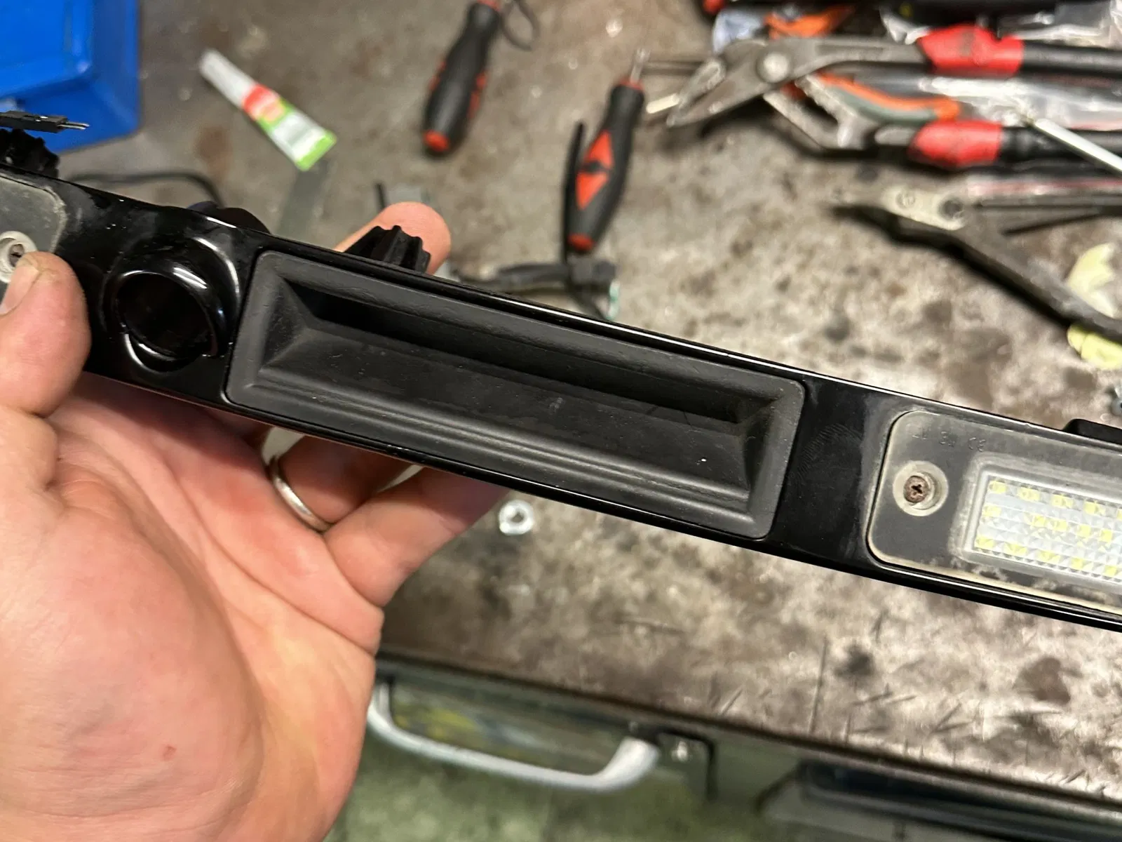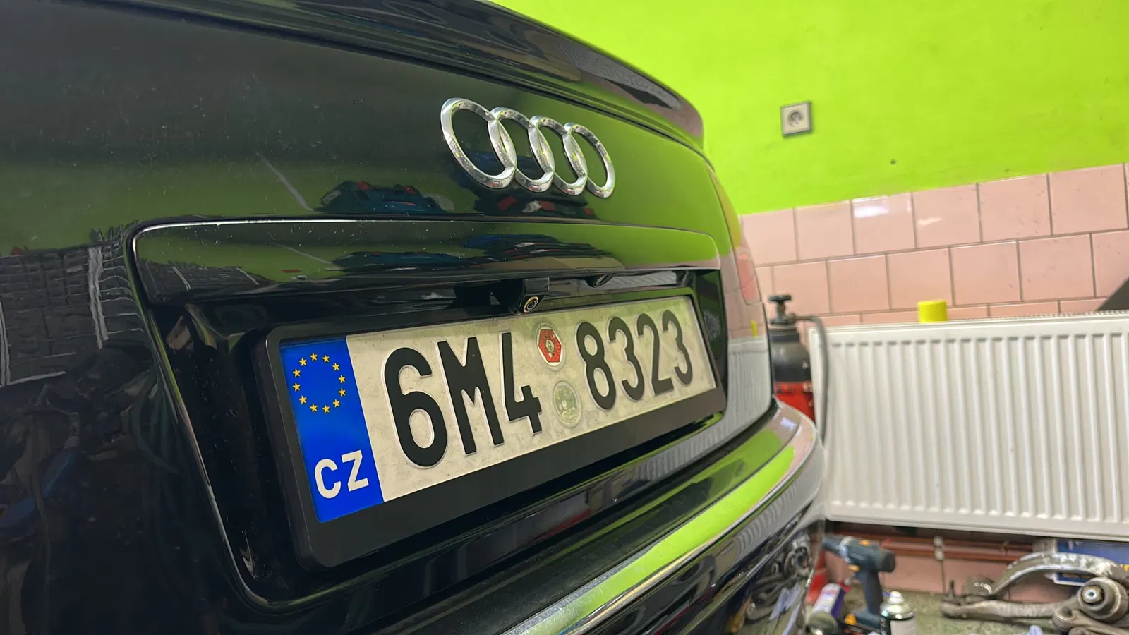 Thay thế nút lớn để mở cốp xe bằng một nút nhỏ hơn từ phiên bản có camera 4E0827565D, sau đó cần điều chỉnh kết nối microswitch và hàn nó vào dây để nó có thể đi qua lỗ nguyên bản.