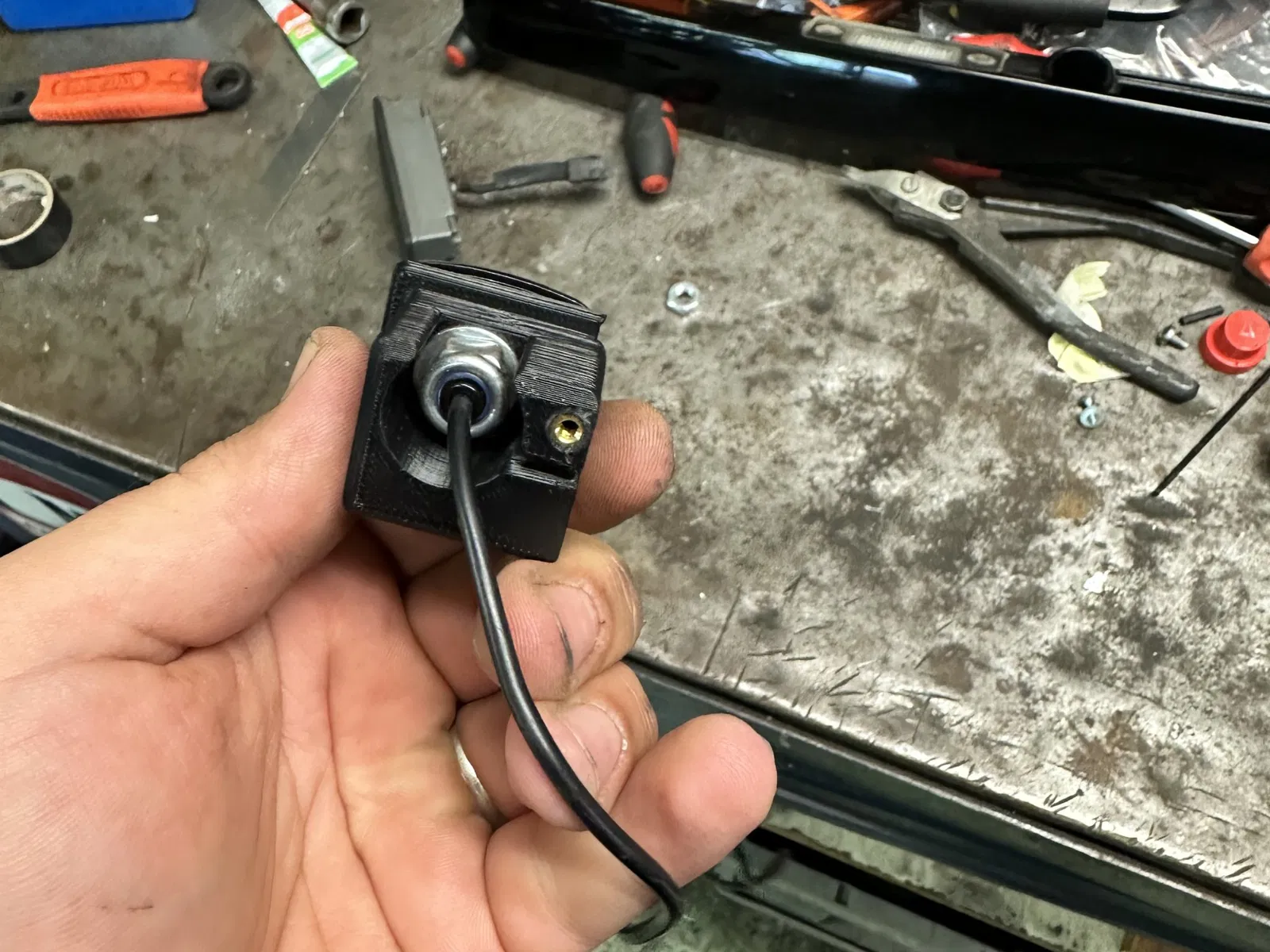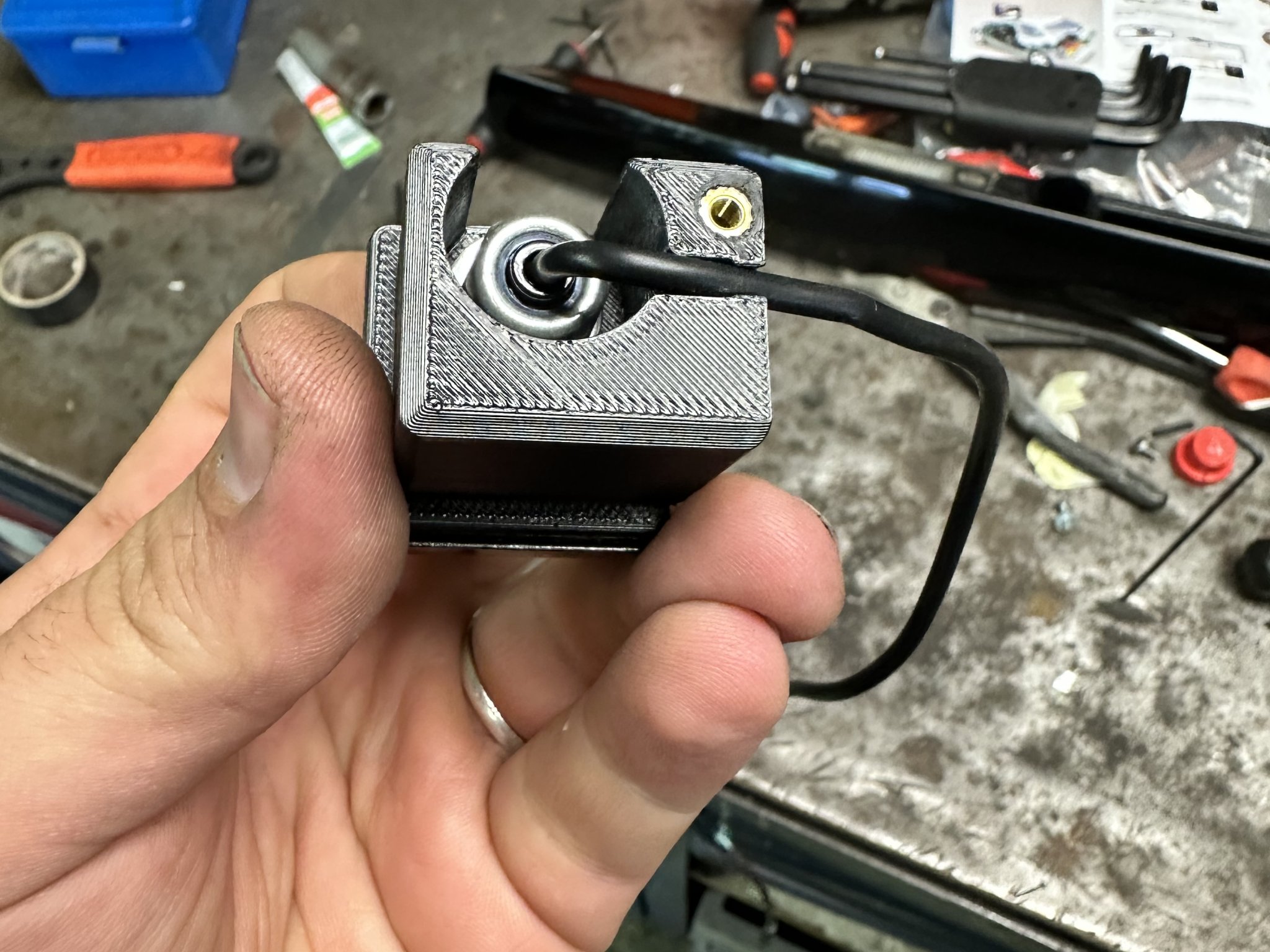 In ấn bộ giảm, chèn đai ốc nóng M3 vào đó và gắn camera. Chèn bộ giảm với camera vào thanh và vặn chặt qua lỗ vít nguyên bản.