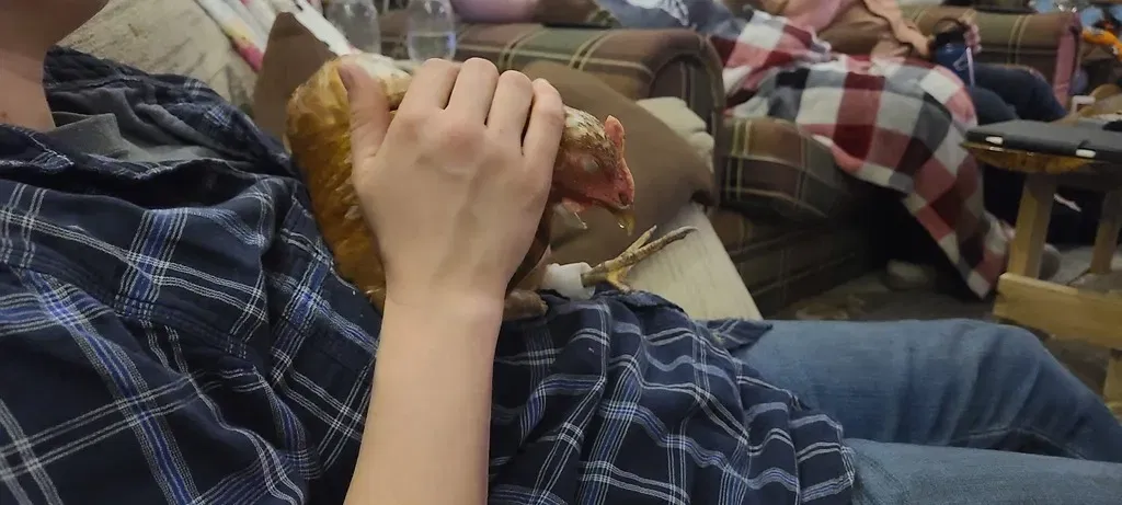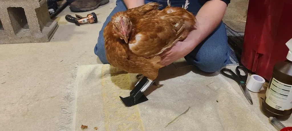 Đây là V5 của một chân giả cho một con gà đã mất chân do tê cóng. Nếu không thì là một con gà mái khỏe mạnh. Nó là…