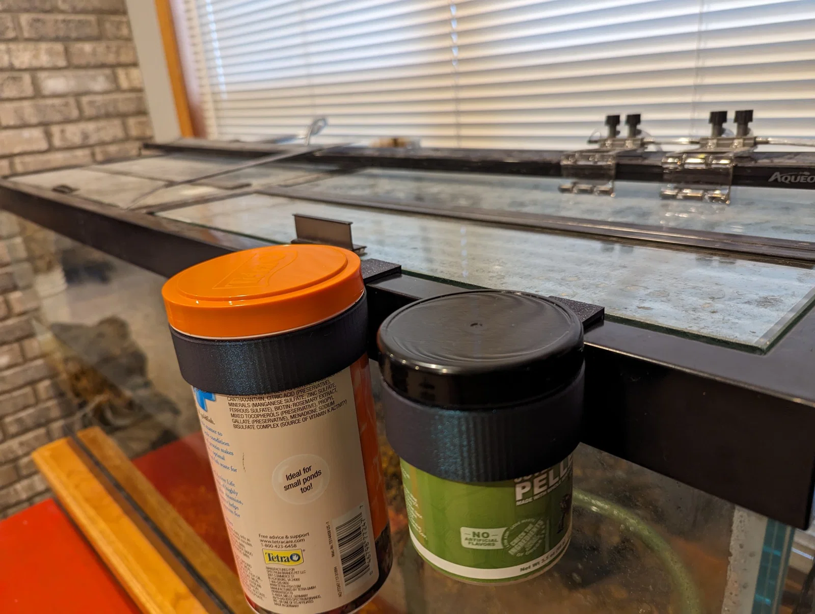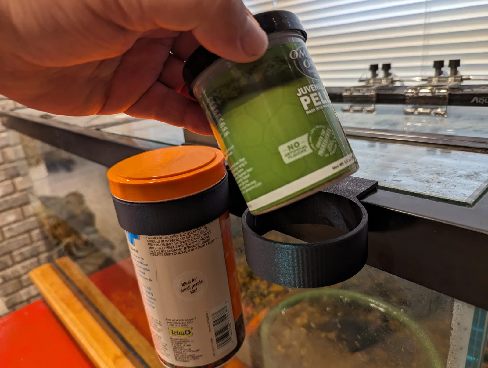 Giá đỡ thức ăn cho cá và rùa treo cạnh bể cá