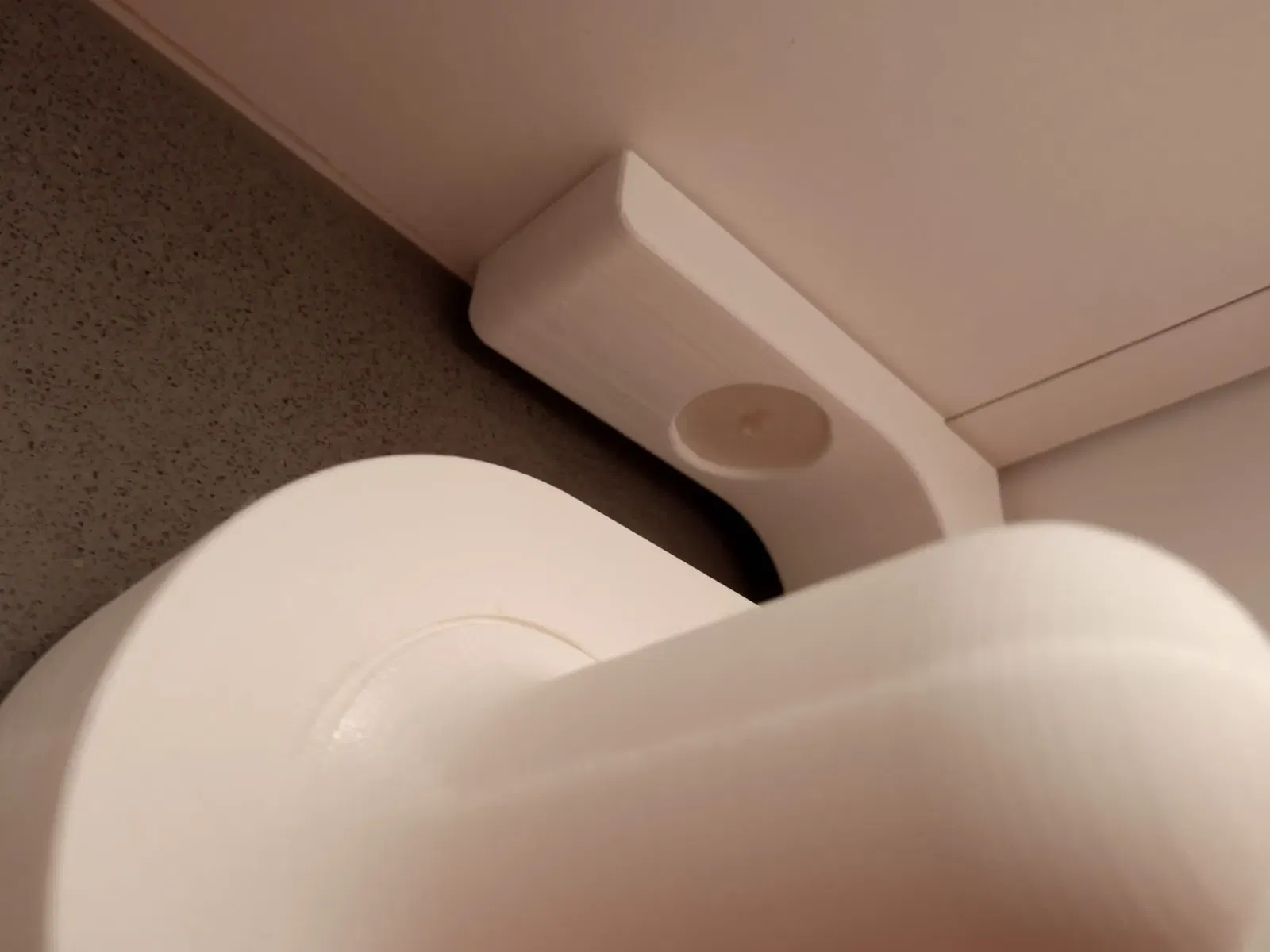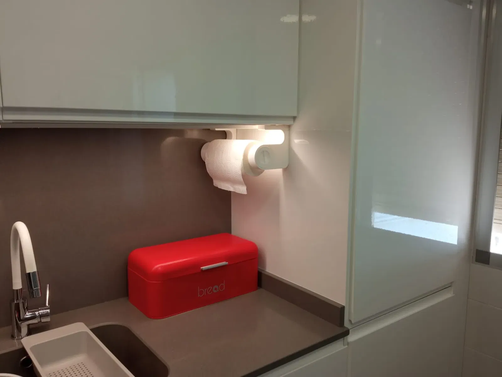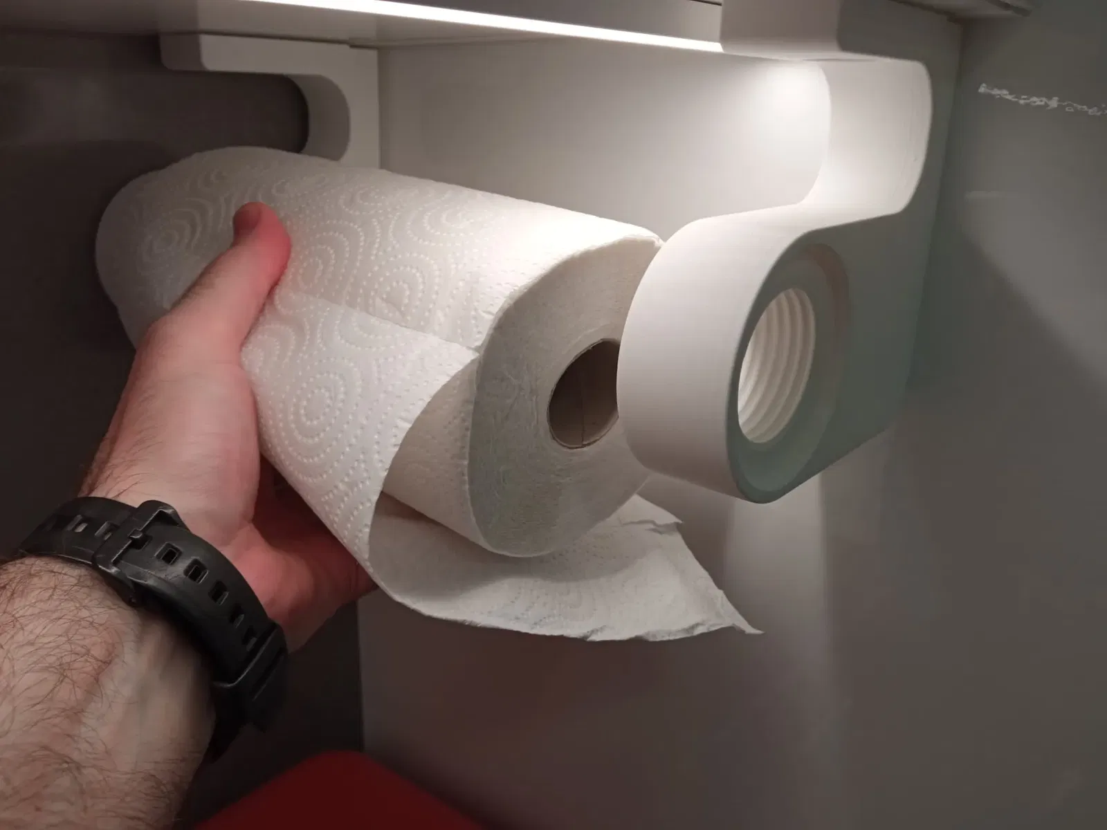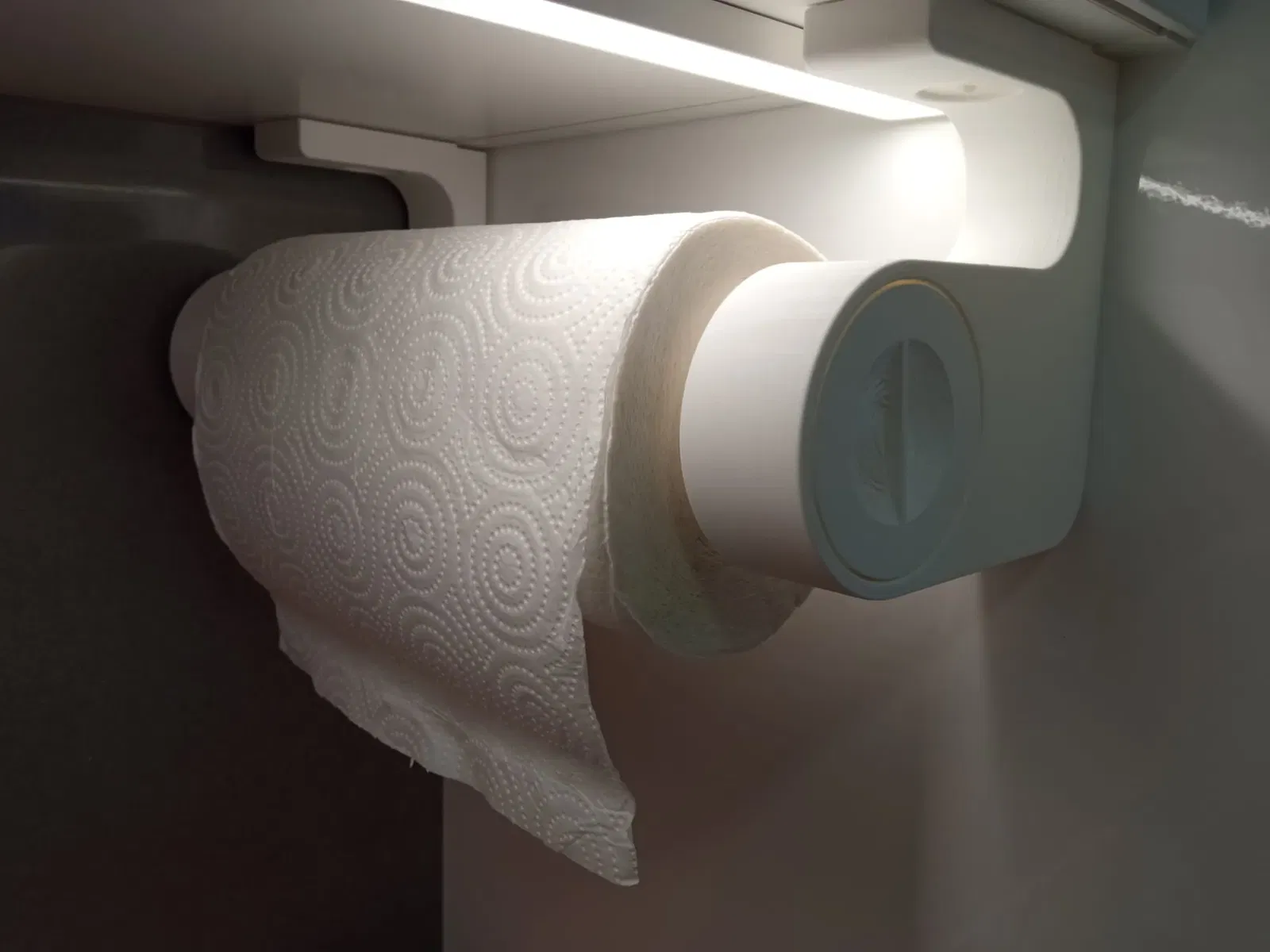Vì vậy, tôi đã bắt đầu đo đạc và độ sâu của tủ bếp treo là đủ để chứa một cuộn giấy, nhưng đã có một số thiết kế được treo với giá đỡ gắn vào kệ của tủ. Điều này đã bị loại trừ.