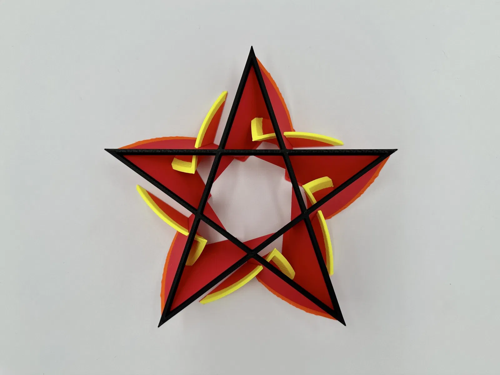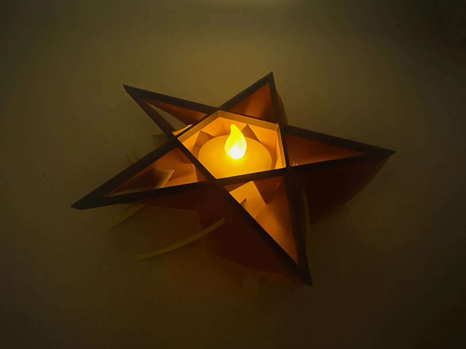 Một tác phẩm điêu khắc huyền bí mô tả một ngôi sao năm cánh trong ngọn lửa. Một ngọn nến LED tea light tùy chọn vừa vặn hoàn hảo ở giữa. Đừng sử dụng nến thật, bạn có thể gây ra hỏa hoạn.