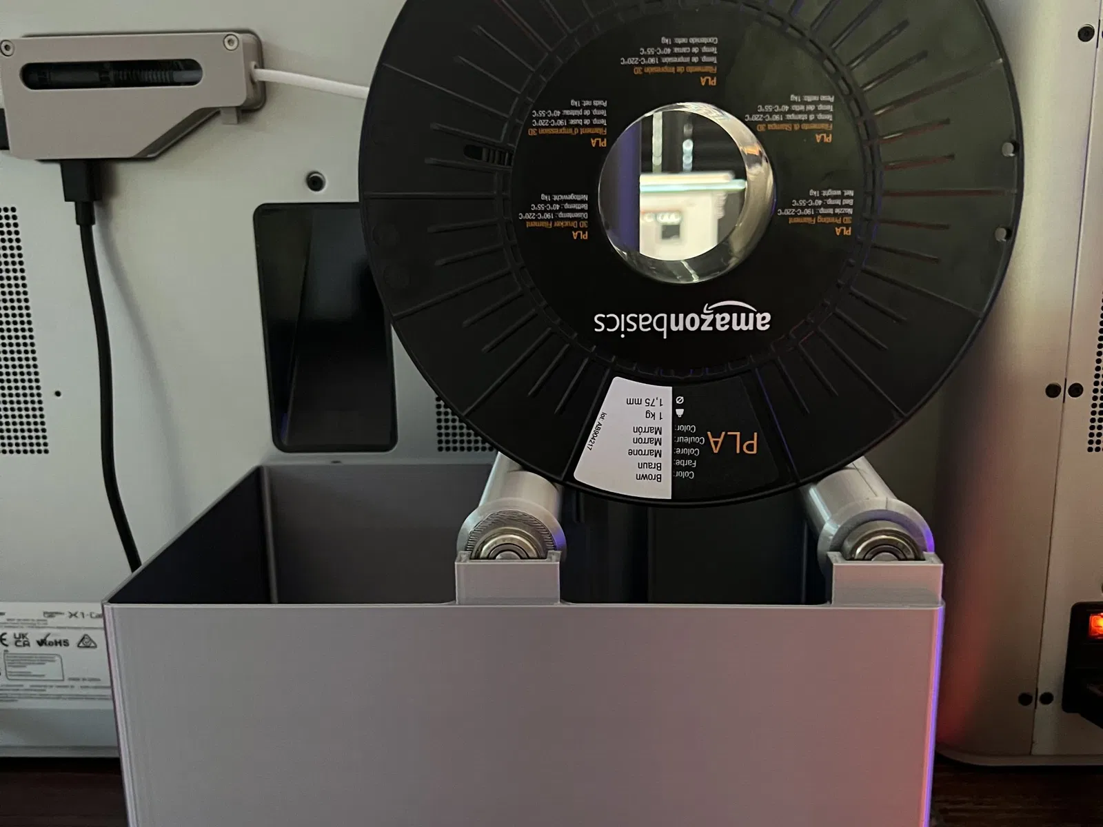 Giá đỡ cuộn của X1s không hoạt động tốt với tôi, vì vậy tôi đã tạo một giá đỡ cuộn trên đỉnh giỏ xả của mình. Điều này giải quyết 2 vấn đề cùng một lúc: Xả được thu thập, và bạn có thể sử dụng các cuộn filament lớn hơn. Chỉ cần rút phích cắm AMS (nếu bạn có) và bạn có thể sử dụng bất kỳ cuộn filament nào, ngay cả những cuộn không vừa với AMS (như Amazon Basics). Giỏ xả không cần bất kỳ hỗ trợ nào để in, các cuộn tốt nhất nên được in với hỗ trợ hỗn hợp đứng thẳng. In ấn này sử dụng bạc đạn skateboard PCS 608, tôi đã lấy của mình ở đây: (100 gói) hoặc ở đây: (50 gói). Lưu ý: Các liên kết là liên kết tiếp thị liên kết, cảm ơn bạn đã ủng hộ!