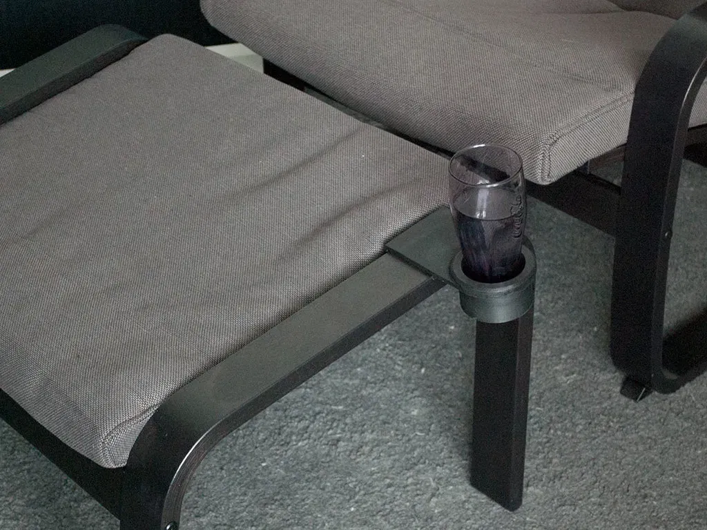 Một giá đỡ cốc được thiết kế cho IKEA POÄNG, cũng có thể sử dụng cho các ghế tương tự. Nó cũng vừa vặn trên bệ chân.