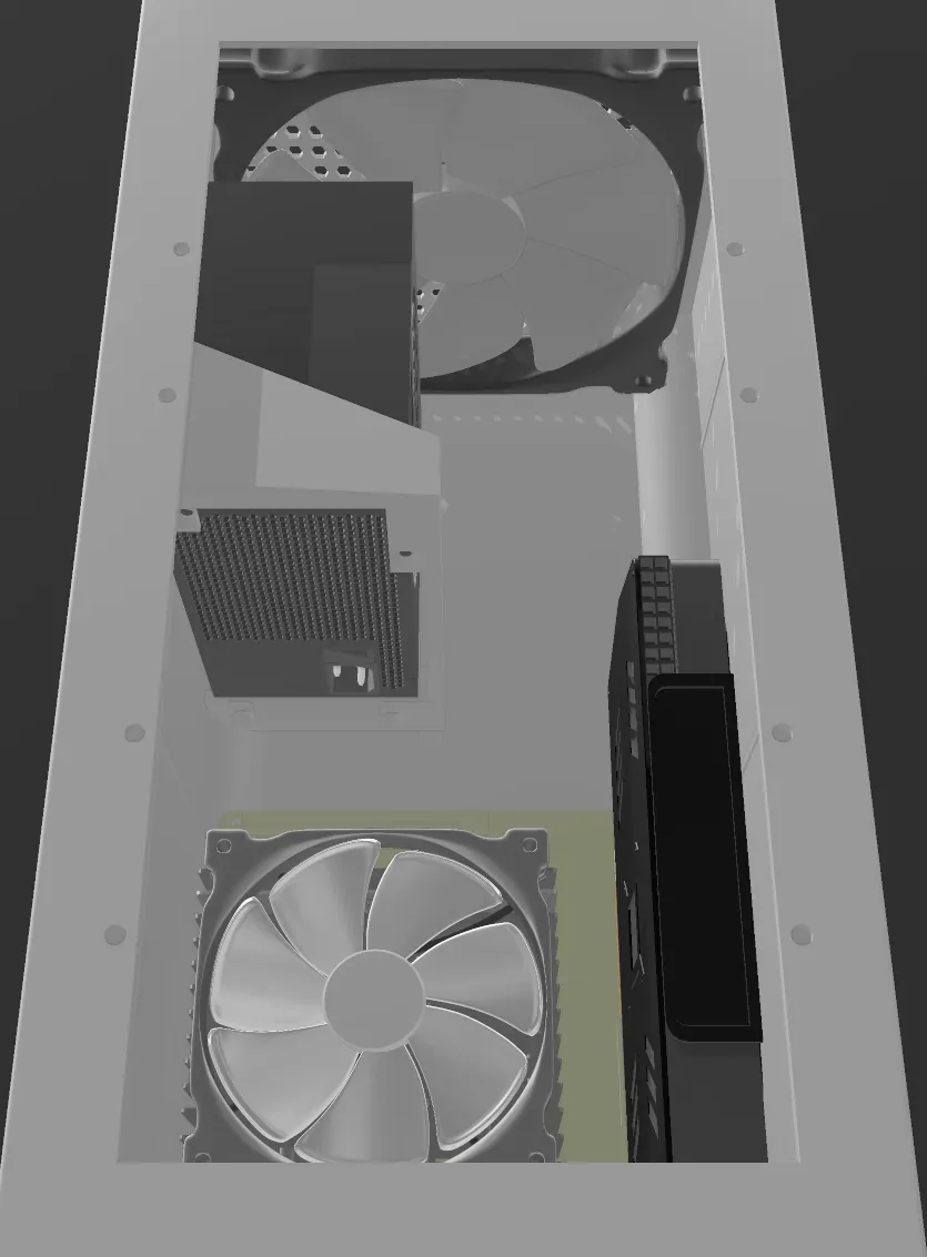 tôi cố gắng làm cho nó giống như một chiếc Xbox Series X nhưng lớn hơn một chút. Bên trong là bo mạch chủ ITX và card đồ họa Asus Dual Fan RX580, nguồn điện là ATX thông thường, quạt trên là 200mm và quạt dưới là 140mm.