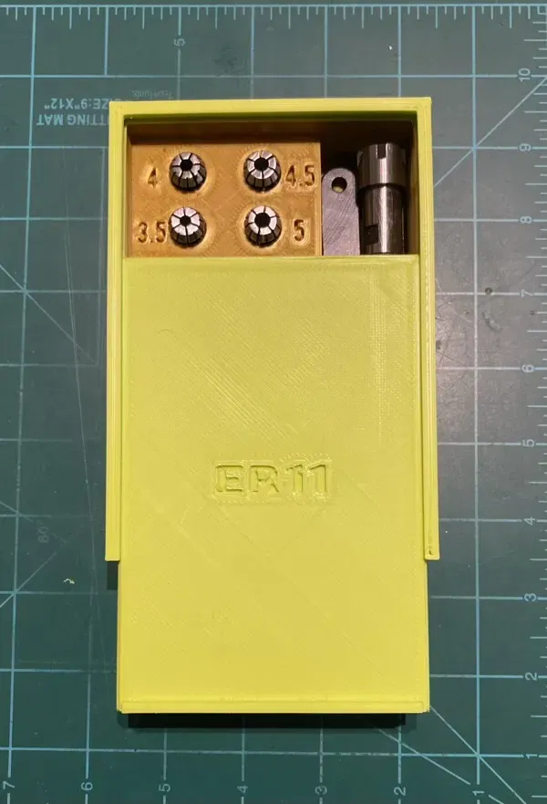 Đây là một hộp khác cho các collet ER11. Nó có thêm không gian để chứa một bộ giữ collet có tay cầm ½” với chiều dài lên đến 5”, cờ lê collet, cờ lê allen, bút chì, chìa khóa nhà thờ, hoặc các vật dụng nhỏ cần thiết khác. Hộp có thiết kế rất chắc chắn, mạnh mẽ với 50% độ đầy và tôi đoán nó sẽ hoạt động tốt với độ đầy thấp hơn.