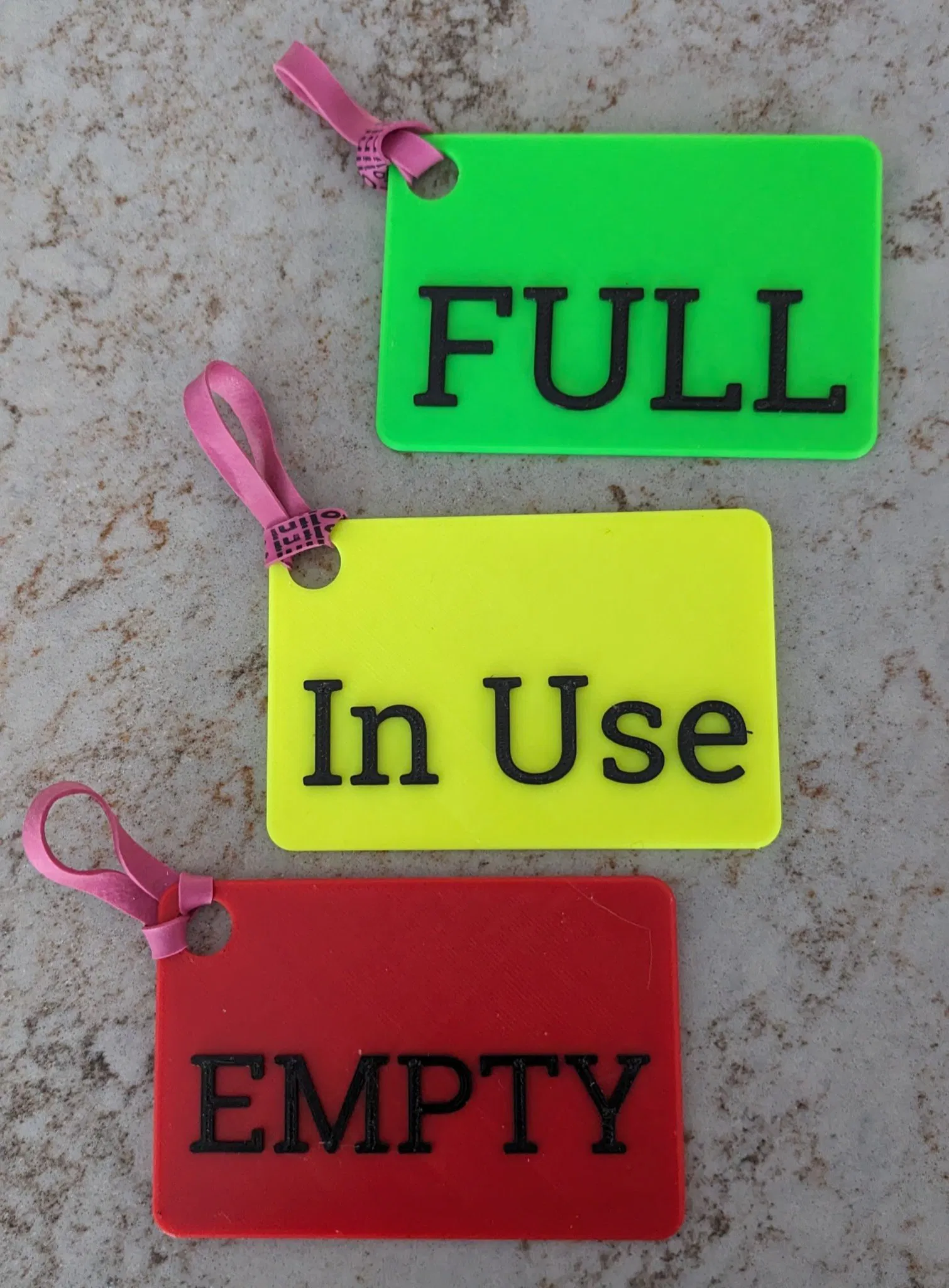 Tôi có hai bình gas trong xe motorhome của chúng tôi và đôi khi gặp khó khăn trong việc nhớ bình nào chúng tôi đang sử dụng vào bất kỳ thời điểm nào. Thật tiện lợi để theo dõi để chúng tôi sử dụng hoàn toàn một bình, sau đó khi sử dụng bình tiếp theo, chúng tôi sẽ làm đầy bình rỗng. Tôi đã mô hình hóa các thẻ và cắt để có sự thay đổi màu sắc cho văn bản, và các màu đỏ, vàng, xanh lá cây cung cấp cho tôi thông tin chỉ trong nháy mắt.