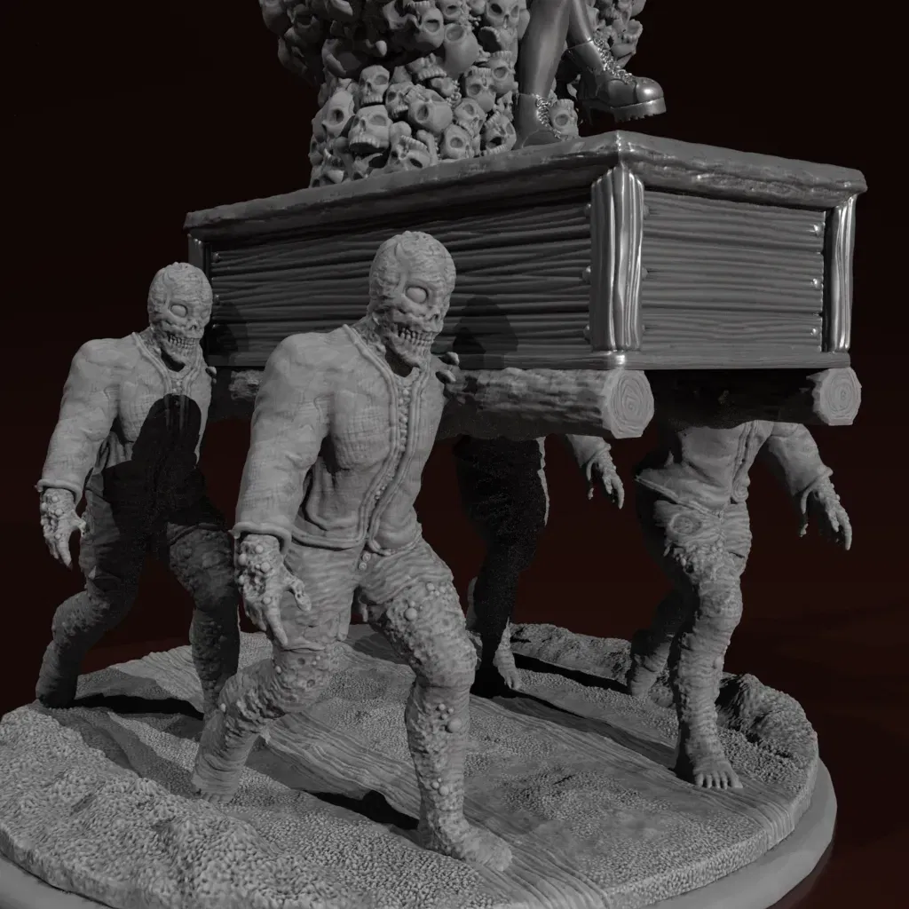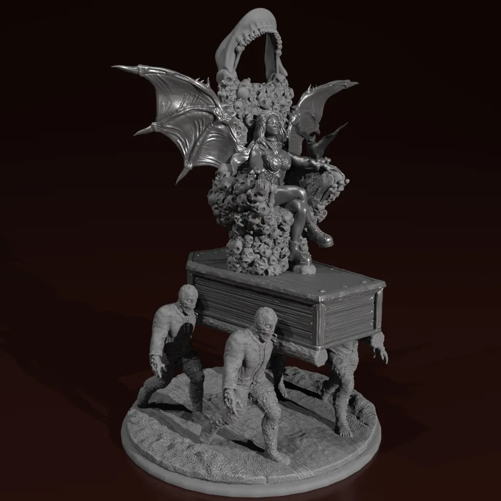 Này đây là Velana the Vampire ngồi trên một ngai vàng, được mang theo bởi những thây ma của cô. Đây là thang đo 28mm