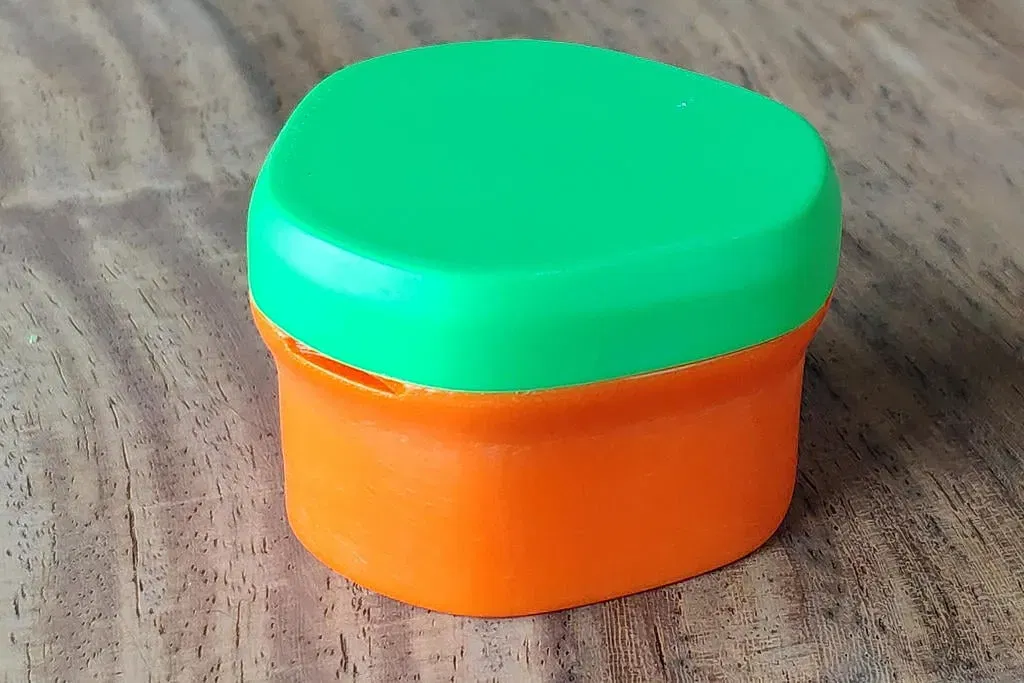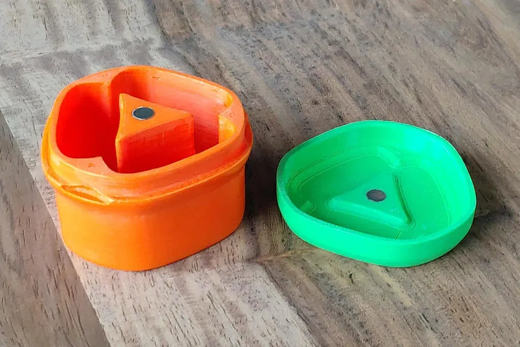 Bạn có thể thêm 2 nam châm nhỏ (D=5 H=1) làm khóa, nhưng không cần thiết. Nó sẽ giữ kín chỉ bằng cách ma sát nếu bạn không làm quá nhiều. :)