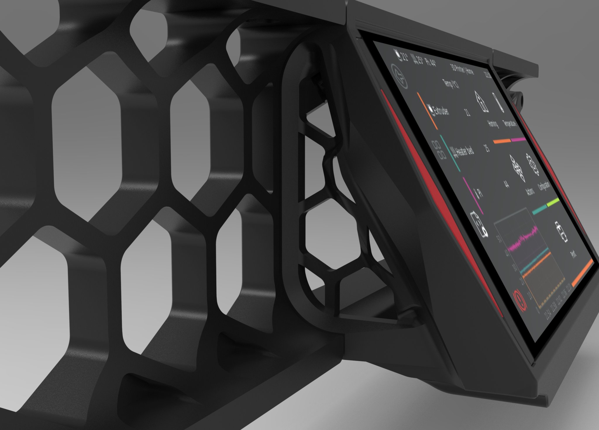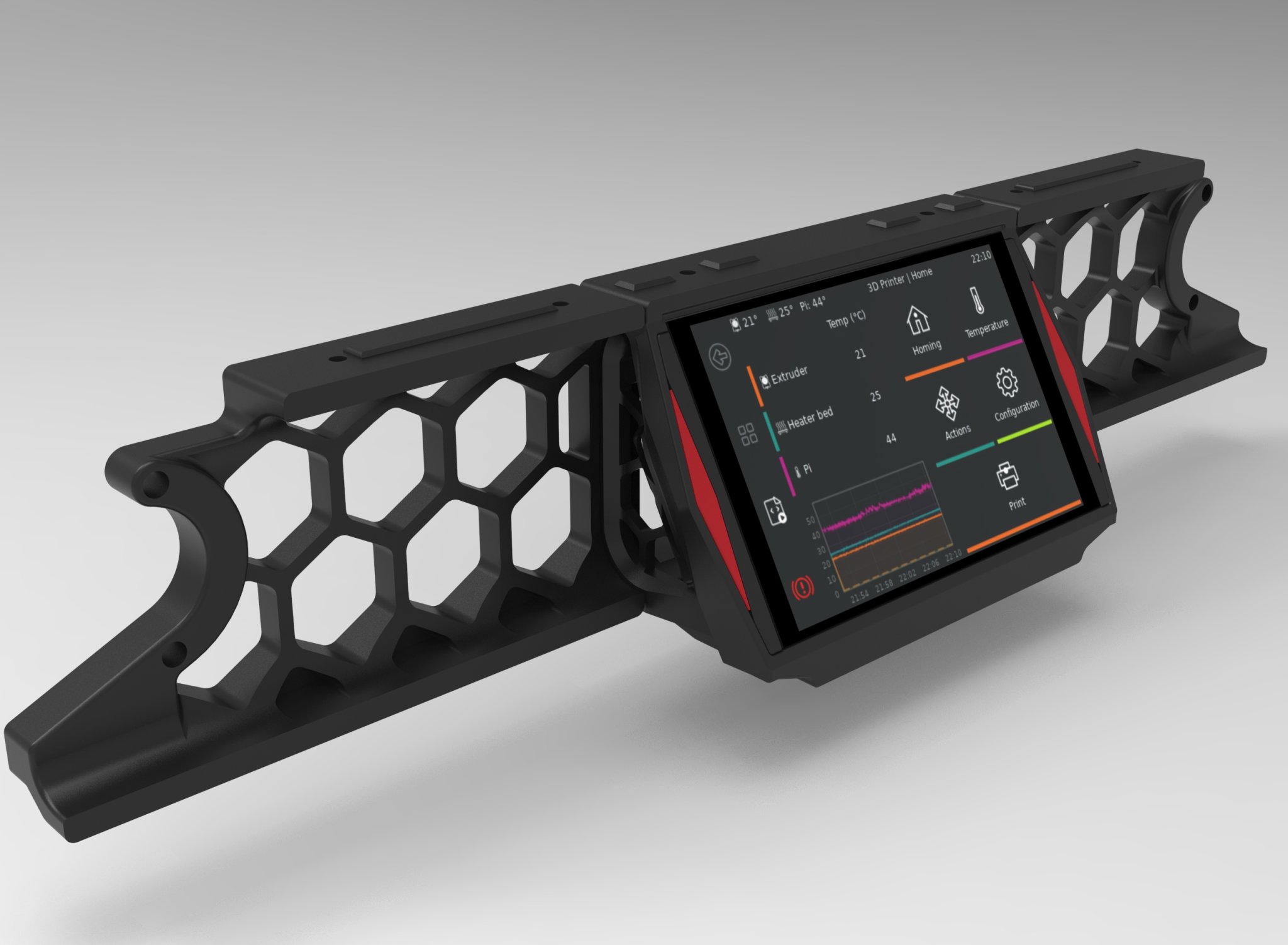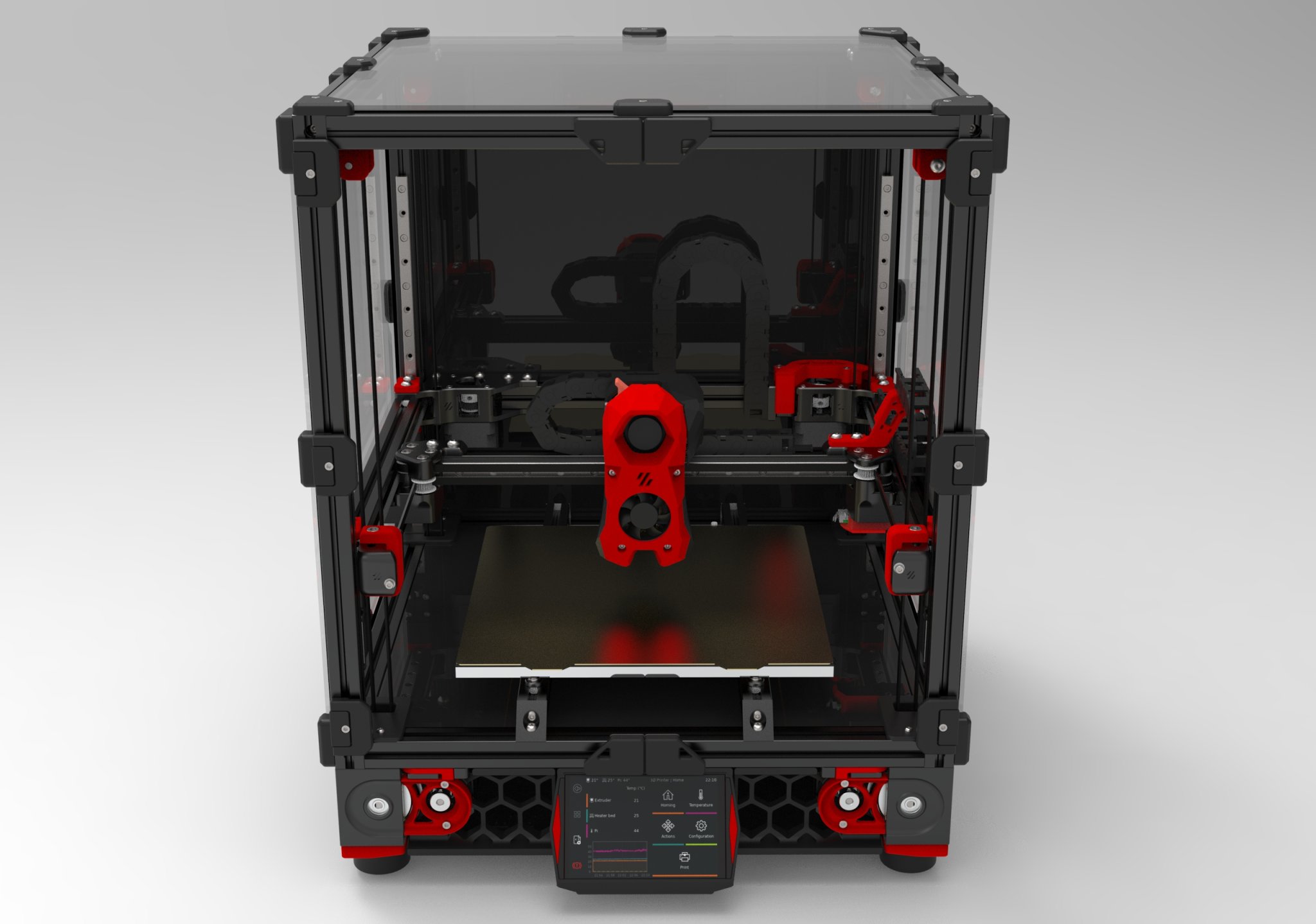 Vỏ được gắn vào mặt dưới của thanh 2020 phía trước, theo cách tương tự như các tấm che bằng 2 vít đầu lục m3x8mm. Màn hình được giữ bằng 4 vít đầu lục M2.5x8mm. Các mảnh nhấn được gắn bằng một vài giọt keo siêu dính.