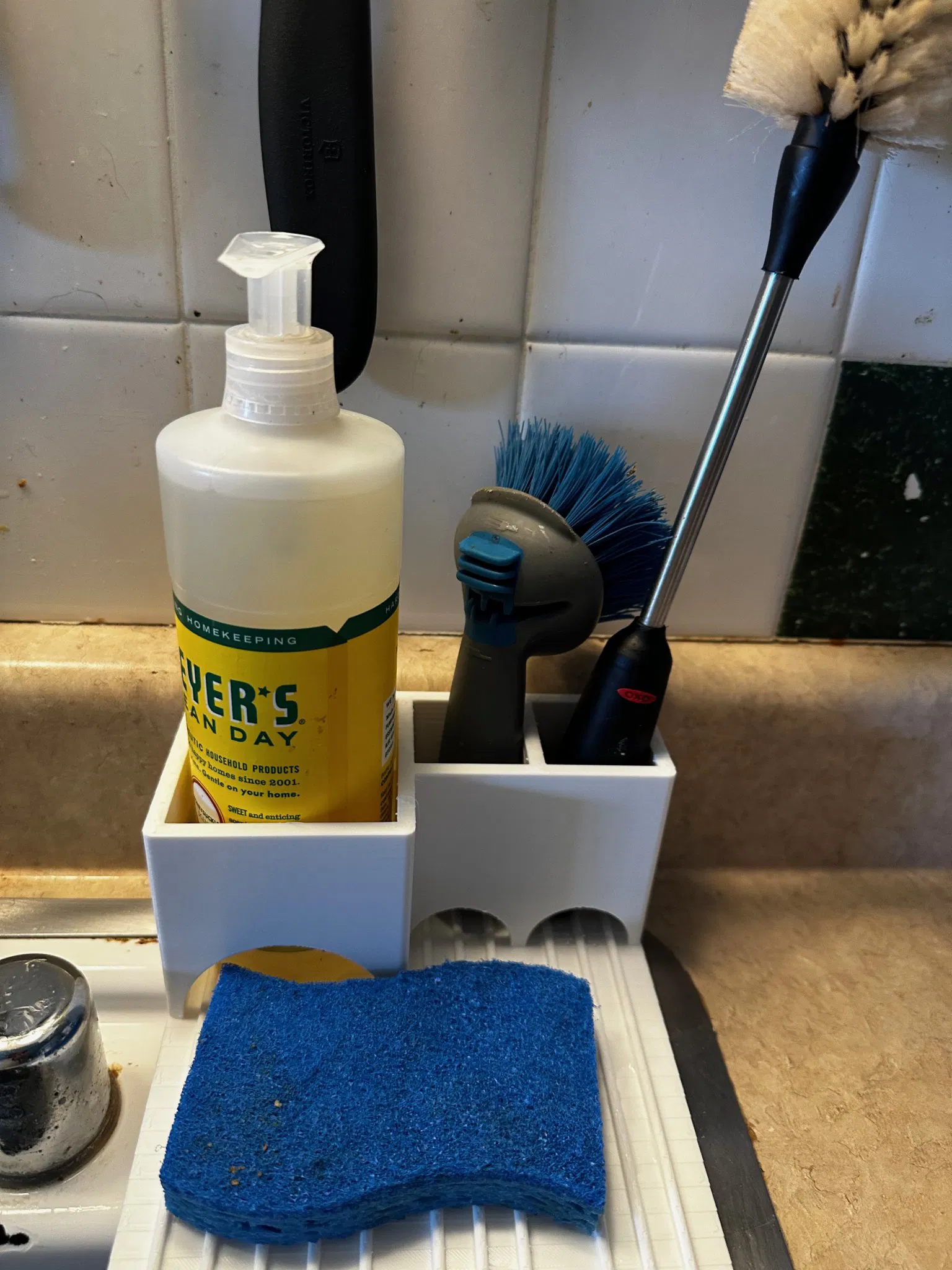 Một caddy cho một chai xà phòng, hai bàn chải và một miếng bọt biển.