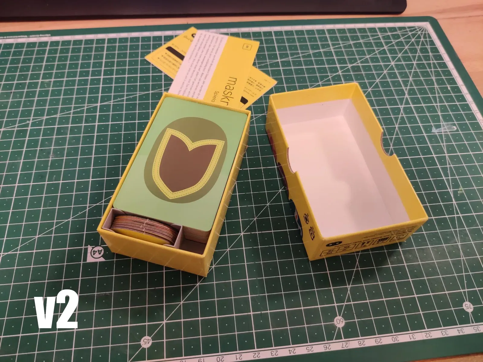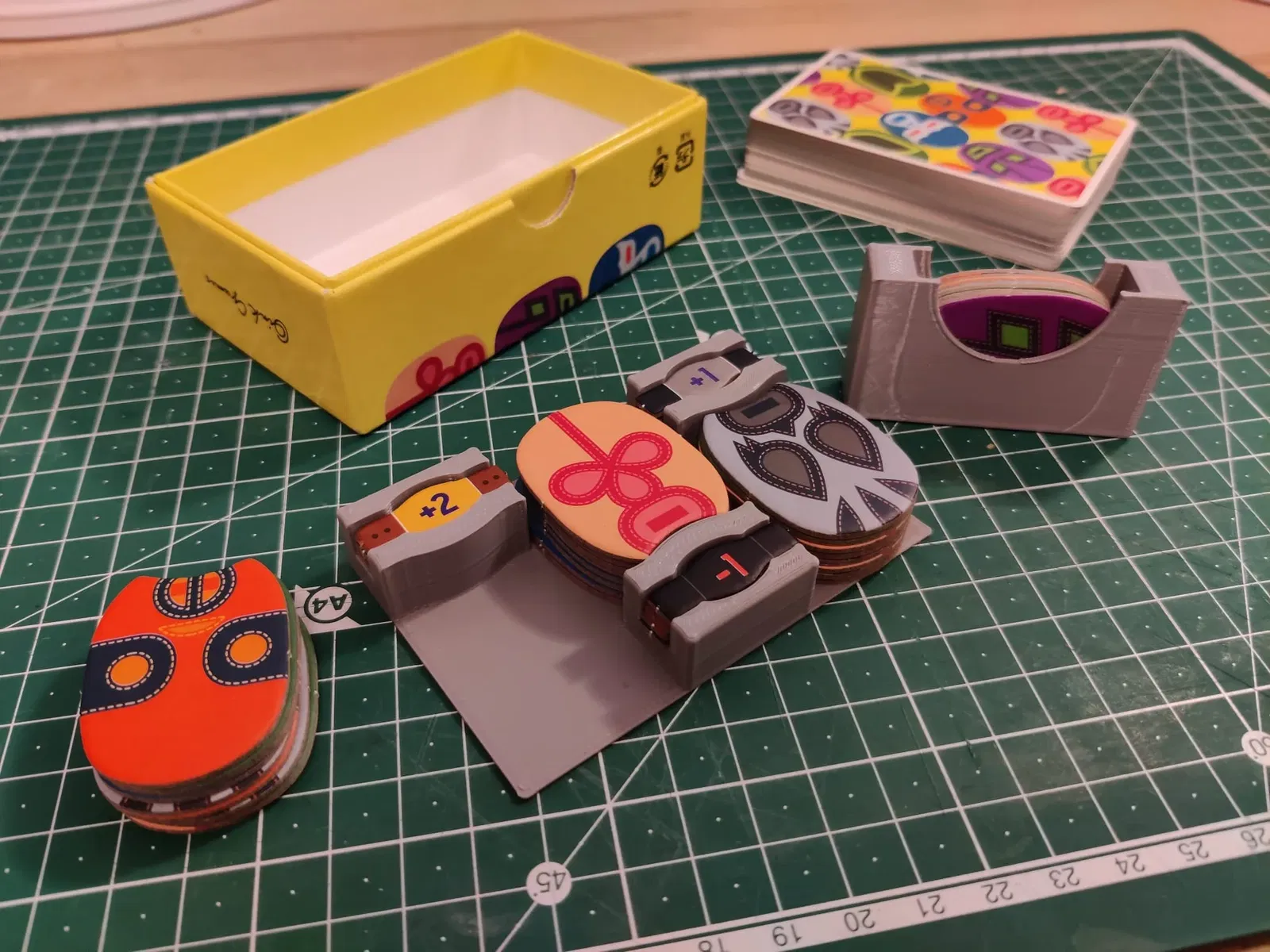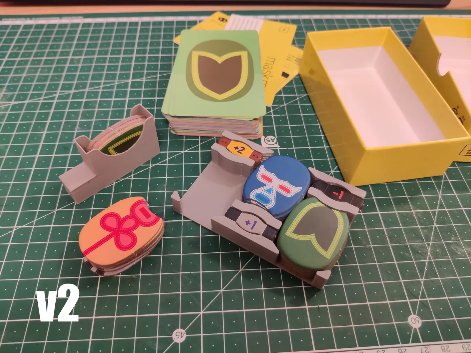 Cập nhật: Tôi đã thêm phiên bản v2. Ở đây, khay mặt nạ đã được cắt tỉa nhiều để tạo ra một khoảng trống giúp dễ dàng lấy thẻ hơn. Ngoài ra, khay chính giờ đây có cấu trúc hỗ trợ nhiều hơn, để các mặt nạ không bị trượt xuống khi lấy khay chính ra khỏi hộp. Chiều cao của khay chính cũng đã được cắt tỉa một chút, điều này dẫn đến việc vừa khít hoàn hảo với nắp của hộp (ít nhất là đối với hộp của tôi... Tôi đã đọc nhiều rằng các hộp trò chơi của Oink có kích thước rất khác nhau nên bạn có thể gặp phải trường hợp khác!).