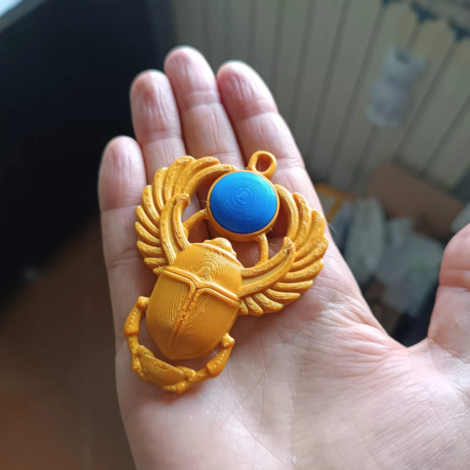 Tôi đã tạo ra một phiên bản remix của một huy hiệu hình bọ hung Ai Cập, trong đó tôi đã tách viên đá quý khỏi thiết kế bọ hung, cho phép in ấn với hai màu sắc khác nhau. Thêm vào đó, tôi đã xoay vòng treo một góc 90 độ, cho phép nó được in mà không cần hỗ trợ.