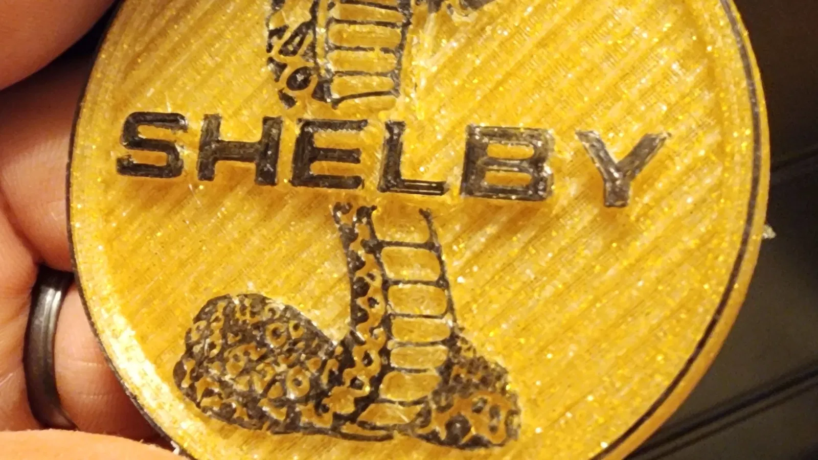 Đây là biểu tượng Shelby GT. Tôi đã tạo ra nó bằng cách sử dụng Fusion 360 và in nó bằng silk PLA. Càng giảm kích thước, bạn sẽ mất một số chi tiết. Tôi đã in của tôi với đường kính khoảng 75mm và sơn lớp trên cùng màu đen để thấy con rắn và chữ viết.