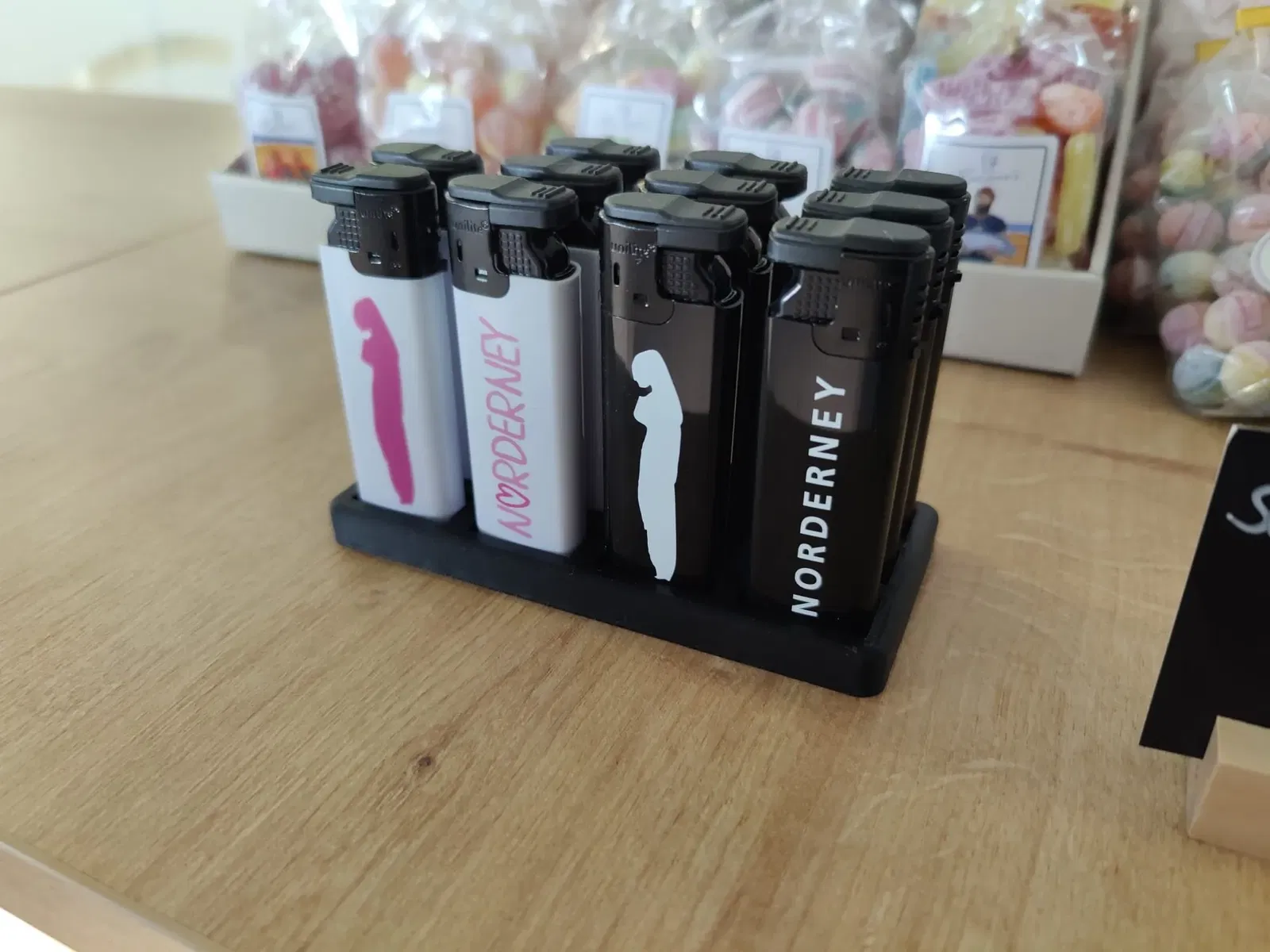 Giá đỡ bật lửa cho bán lẻ, trạm xăng hoặc tương tự. Nó chứa được 12 bật lửa. Một lỗ có kích thước 13x25,5 mm. Nếu bật lửa của bạn không vừa, chỉ cần phóng to tệp một chút.