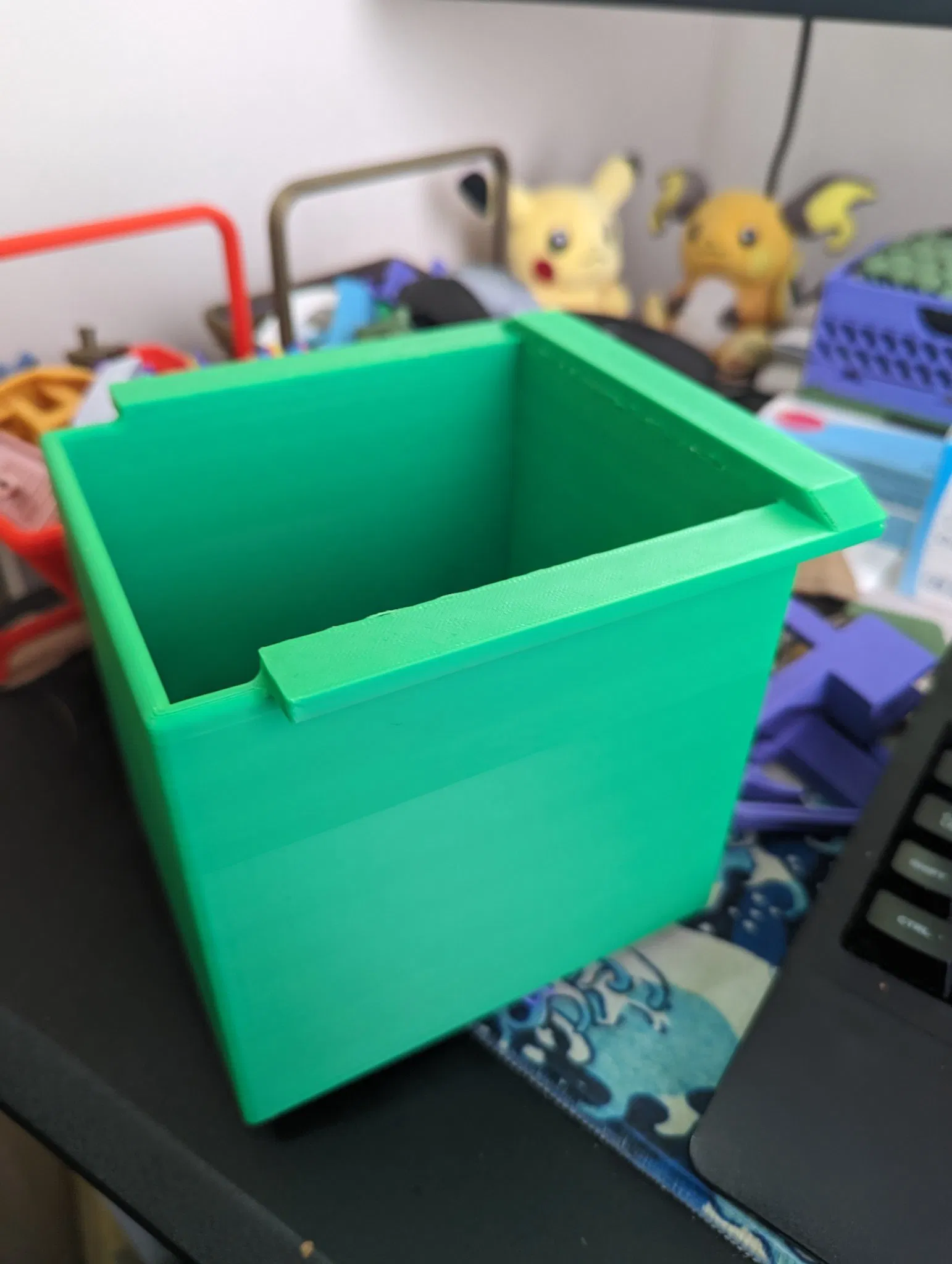 Thùng rác là một hệ thống hai phần, thùng rác là phần hộp và kẹp gắn vào bàn. Tôi đã làm của mình bằng PLA, mặc dù tôi sẽ đề xuất sử dụng các vật liệu cứng hơn như ABS/PETG cho kẹp nếu thùng rác đang chứa các vật nặng. Thùng rác được thiết kế để trượt ra khỏi kẹp để dễ dàng đổ rác.