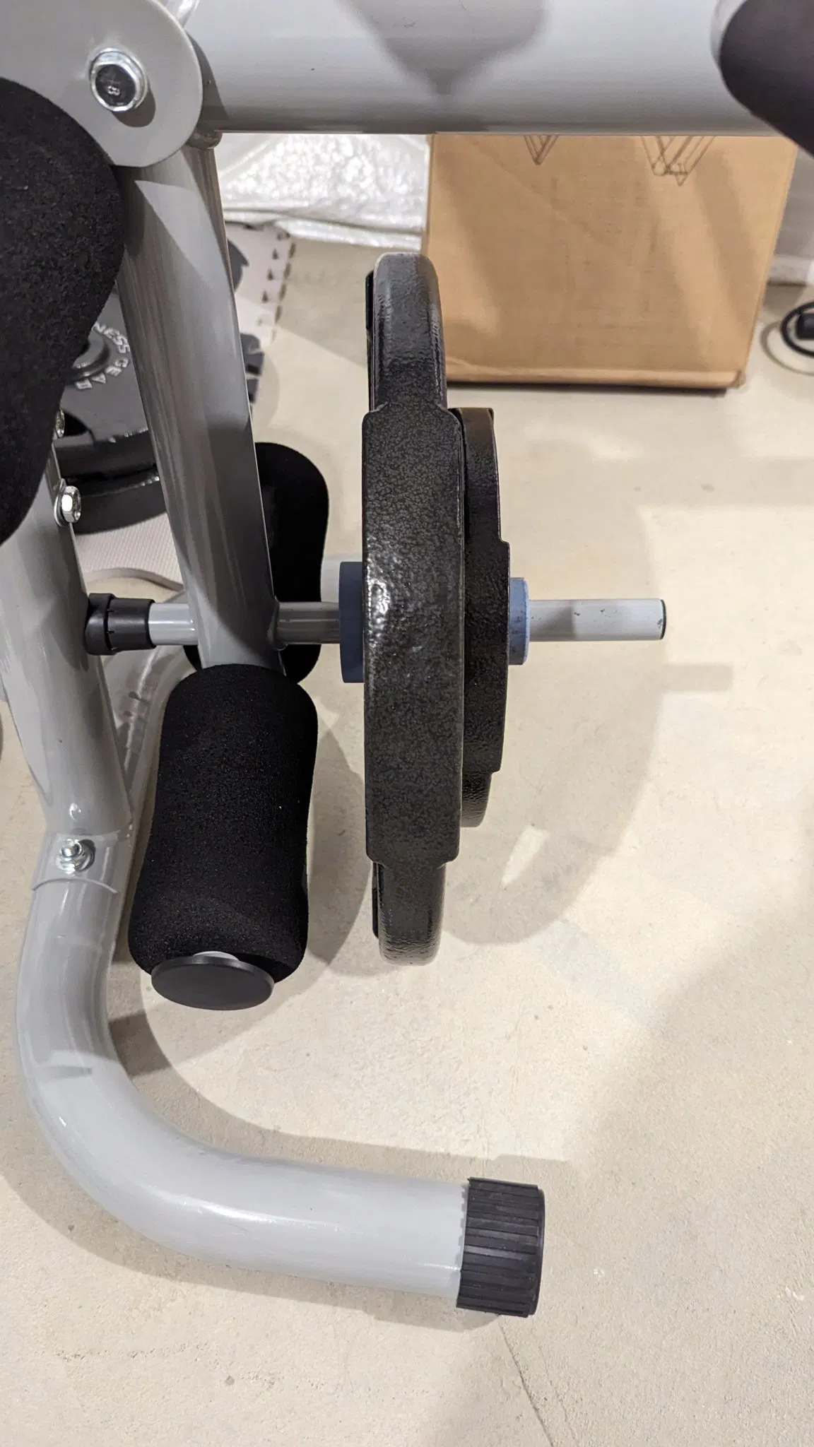 Máy đẩy tạ của tôi có một phụ kiện nâng chân, vấn đề duy nhất là thanh giữ tạ có đường kính ngoài 1". Tôi đã làm bộ chuyển đổi này để phù hợp hơn với đường kính trong của tạ, vì vậy chúng di chuyển ít hơn rất nhiều.