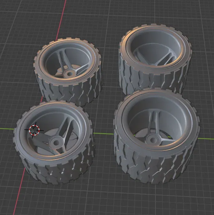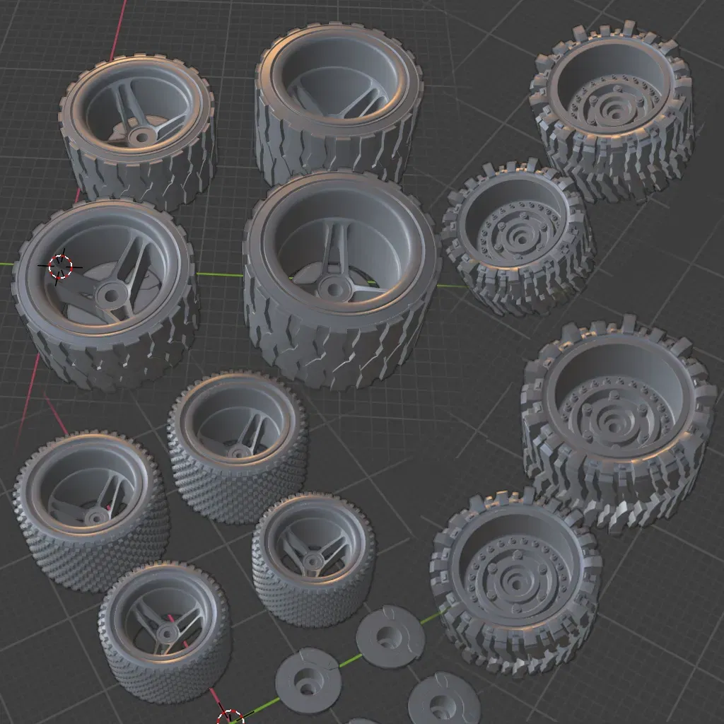 Lốp và vành phong cách off road bogger và street bash, tất cả trong một combo lốp/vành giống như bánh xe ô tô Hotwheels 1$. Đường kính ngoài là kích thước lốp offroad tiêu chuẩn của hot wheels (13mm và 16mm) cho trục 0.8mm (kích thước hot wheels). Các bánh xe street bashers dành cho xe thể thao và có đường kính 10.5 và 10.8 mm. Một số rotor có kích thước cho ống có đường kính 1/16. Tên tệp có kích thước đường kính. Tôi đã xác minh kích thước và đảm bảo không có mô hình không đồng nhất cho các mô hình. Các bánh xe dựa trên bánh xe và lốp R/C (OFNA tri spokes và lốp Panther Komodo Dragon). Các bánh xe mặt rắn dựa trên vành Black Rhino Armory. Nếu bạn thích hãy theo dõi @alfthenerd trên Instagram và nhớ giữ cho mình nhỏ bé nhé bạn :D.