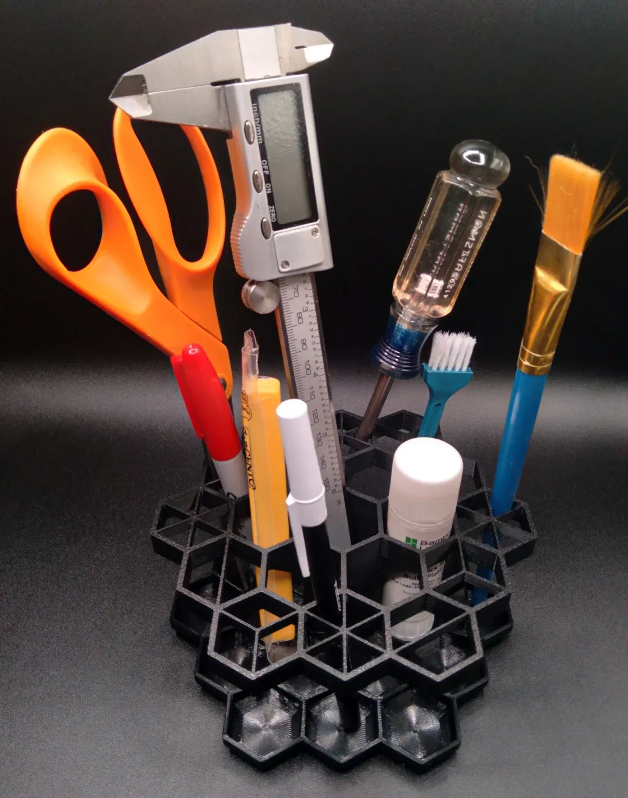 Biến không gian làm việc của bạn thành hình lục giác với bộ tổ chức hình lục giác này. Chỉ cần in các phần và ấn Tháp vào Đế. Keo siêu dính sẽ giúp.