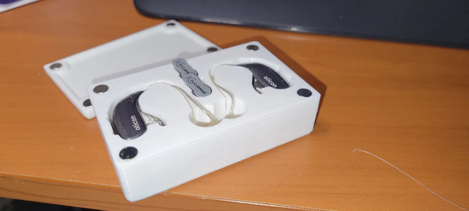 Hộp này chứa một cặp máy trợ thính Oticon "More" (1, 2 hoặc 3) với nắp sử dụng nam châm để giữ cố định.